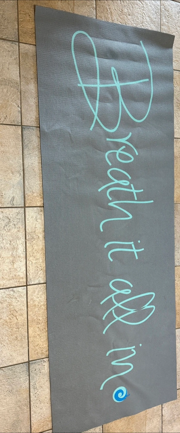 Selling a yoga mat in good condition. It's grey with the words 'Breath it all in' written on it in a light blue colour.