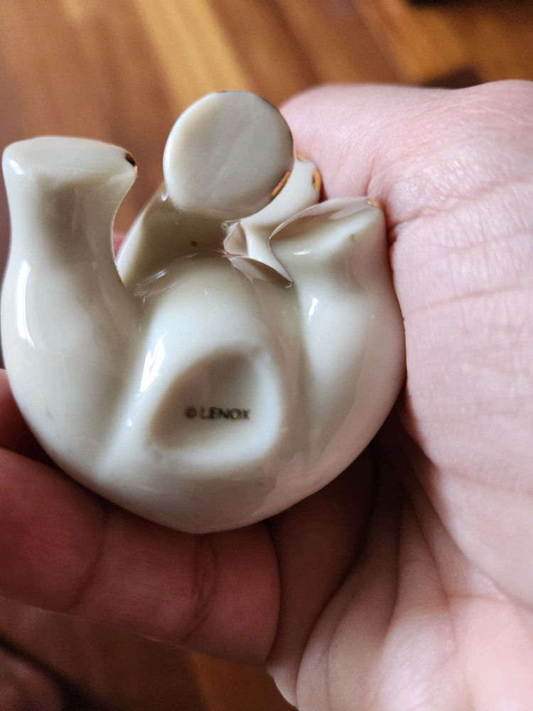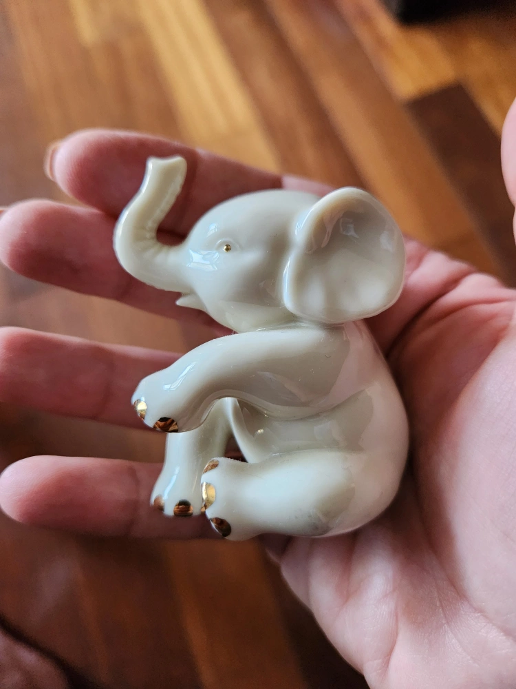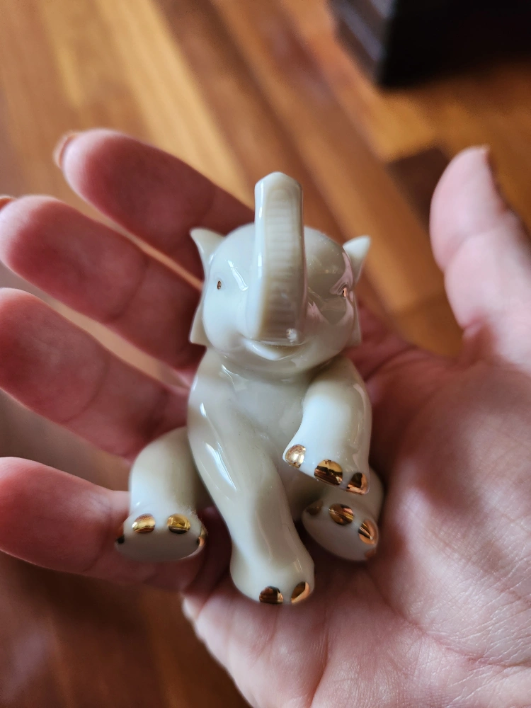 I'm selling a cute Lenox elephant figurine! It's a small, collectible piece that would look great on a shelf or desk. The figurine is in great condition with gold accents on the feet and ears. It's a charming addition to any collection!