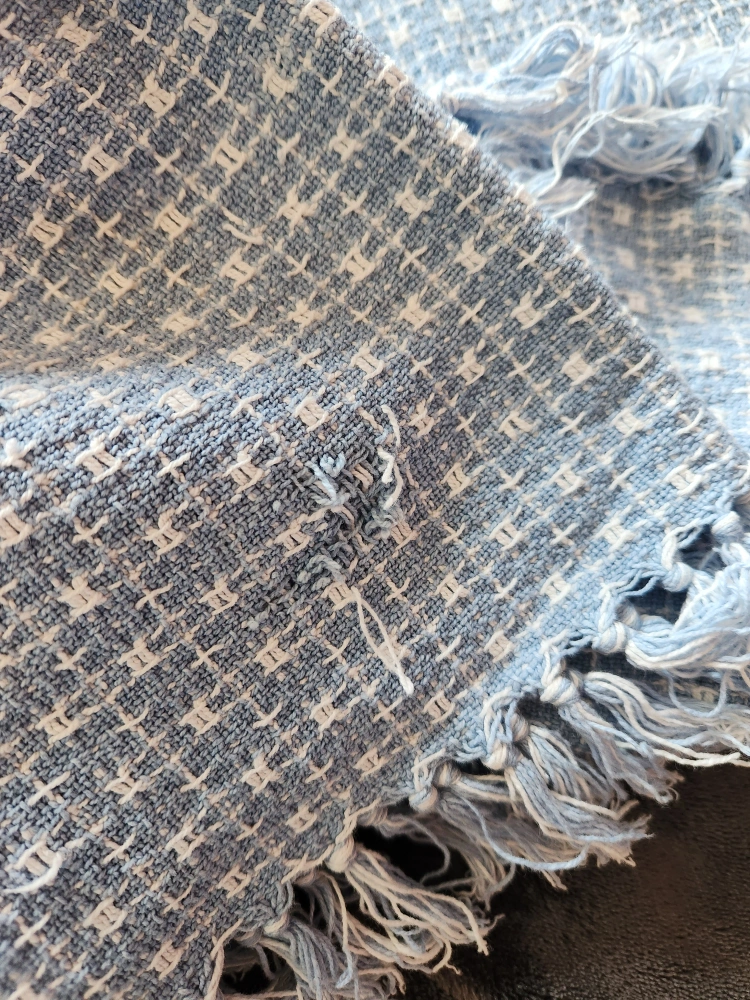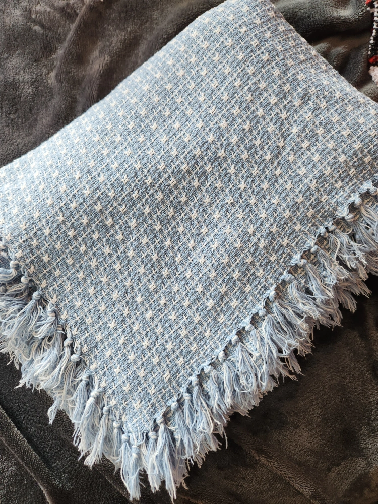 This is a light blue throw blanket featuring a textured pattern and fringe detailing. It's perfect for adding a cozy touch to any room. There is a small defect in the weave as shown in the second picture which can be hidden if used as a sofa throw decoration.