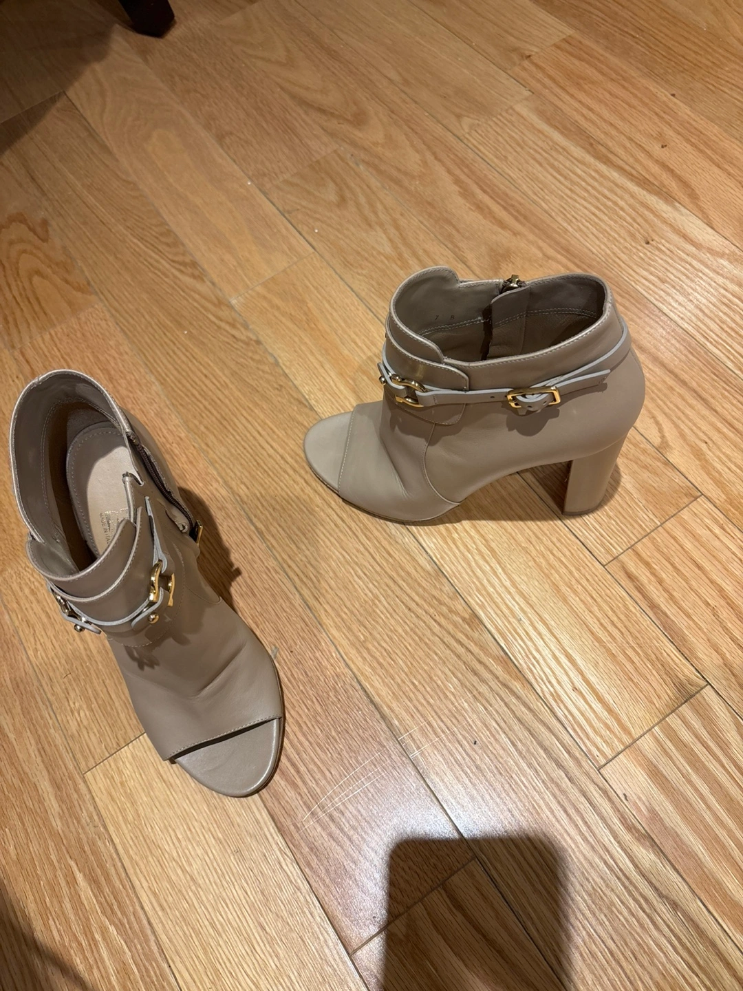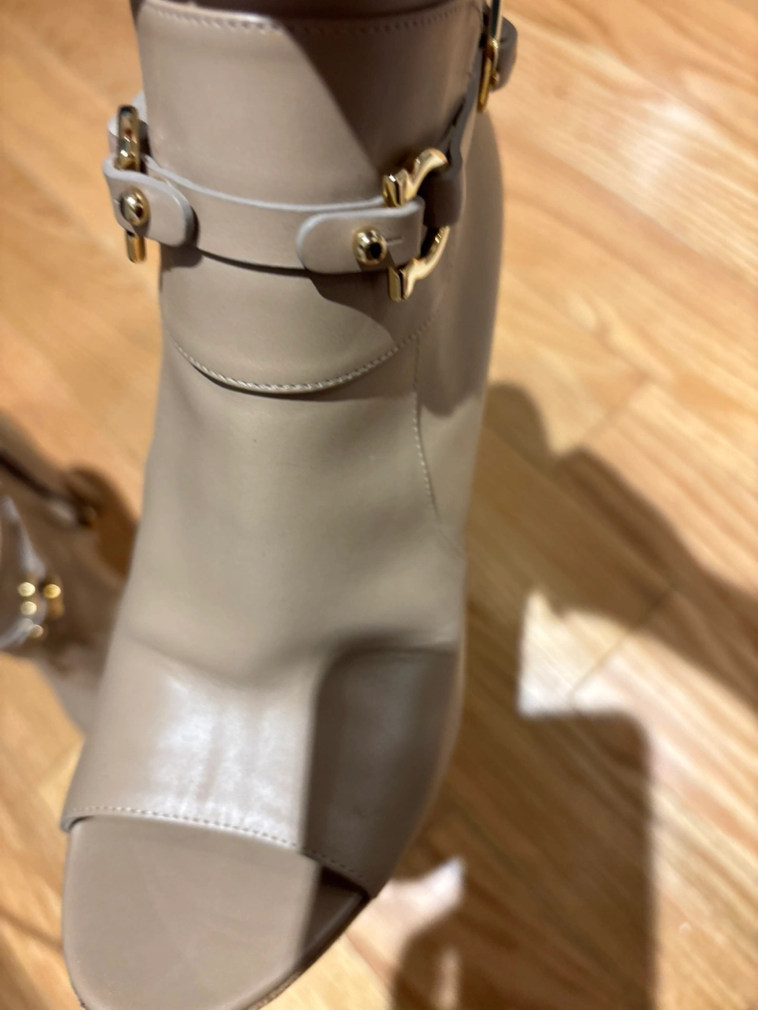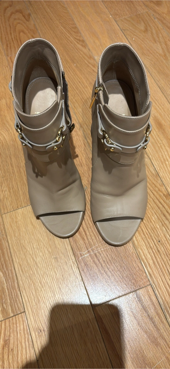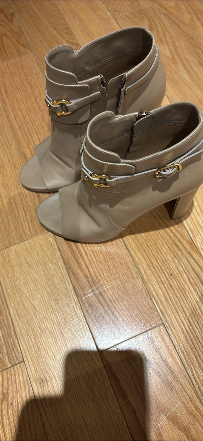 Here are some Salvatore Ferragamo open-toe booties! They are crafted from a beautiful beige leather. They feature gold-tone hardware and a block heel. They are in good condition with some signs of wear.