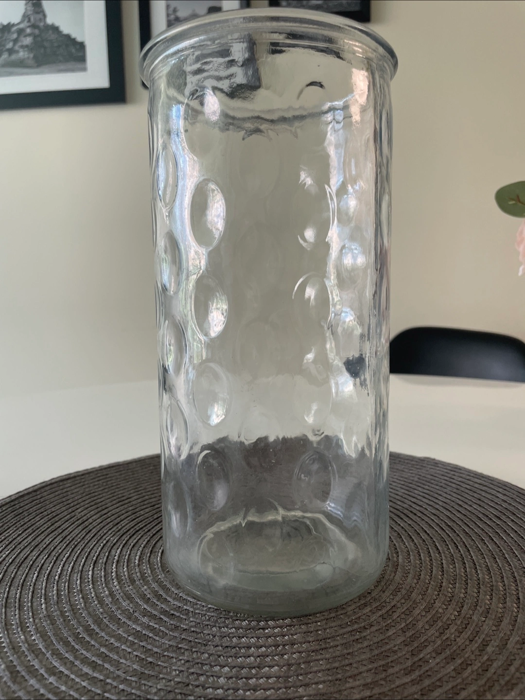 535Selling a clear glass vase with a unique bubble design! It's in great condition and would be perfect for florals or decoration. 10 inches tall