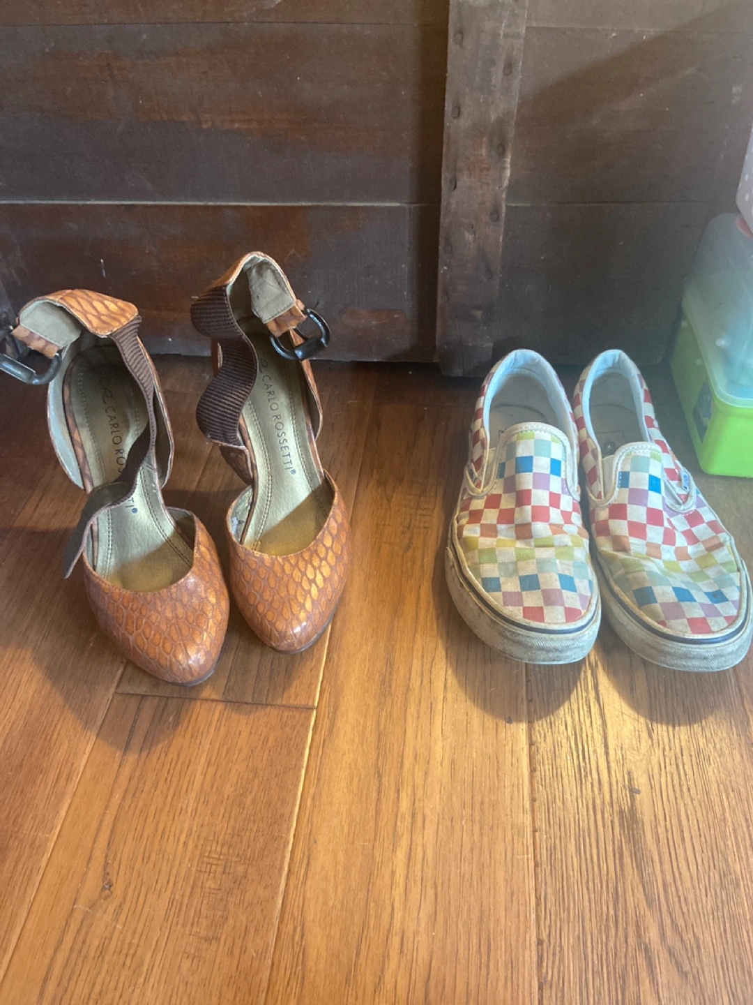 Selling a pair of Carlo Rossetti heels with a snakeskin pattern and ankle strap, alongside a pair of Vans slip-ons with a colourful checkerboard pattern. Both are in good condition and ready for a new home! vans are. Size 8 women’s and heels are roughly a 7-7.5. Trades are welcome as well
