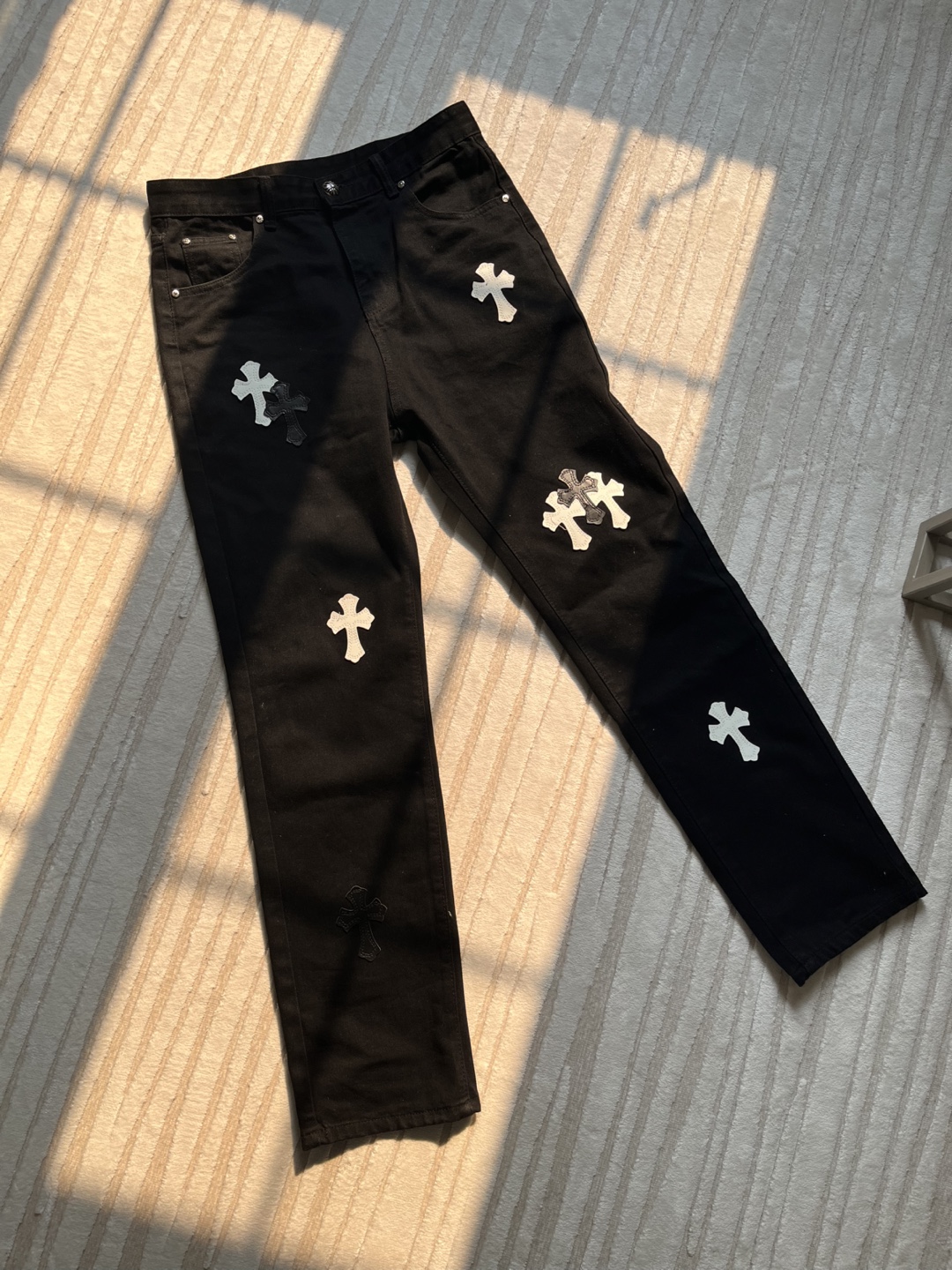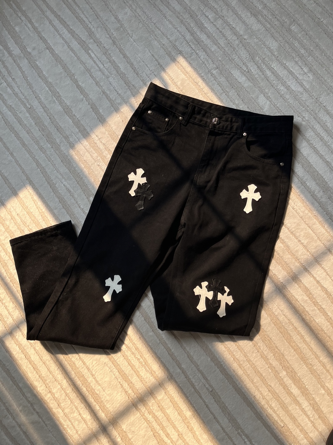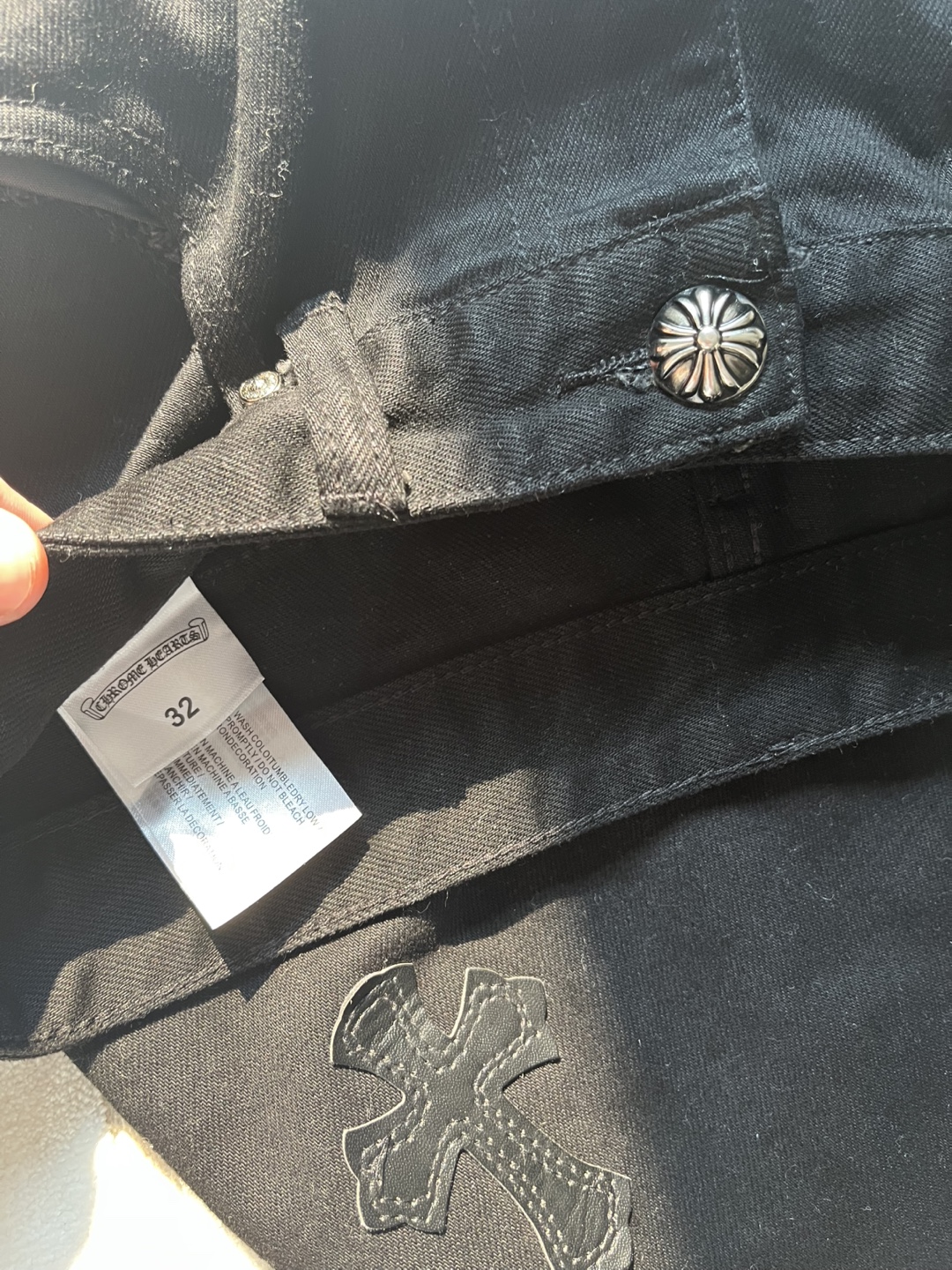 Selling a pair of Chrome Hearts x Levi's jeans in black. They feature cross patches and lettering. The jeans are in great condition and ready for a new home!