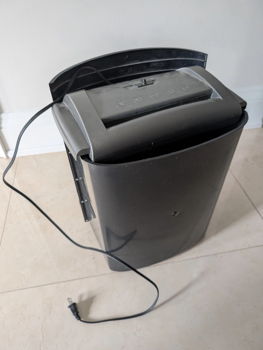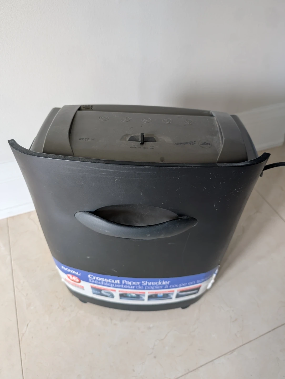 GBC Shredmaster SC60 crosscut paper shredder. It's a 16-sheet capacity shredder, perfect for home or office use. The unit has a handle for easy lifting and a large bin for shredded paper. It's a reliable way to dispose of sensitive documents securely!