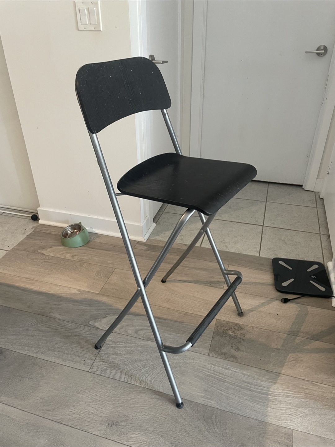Selling a black folding bar stool. It's in good condition and perfect for adding extra seating to your kitchen or bar area! The stool is easy to fold and store when not in use