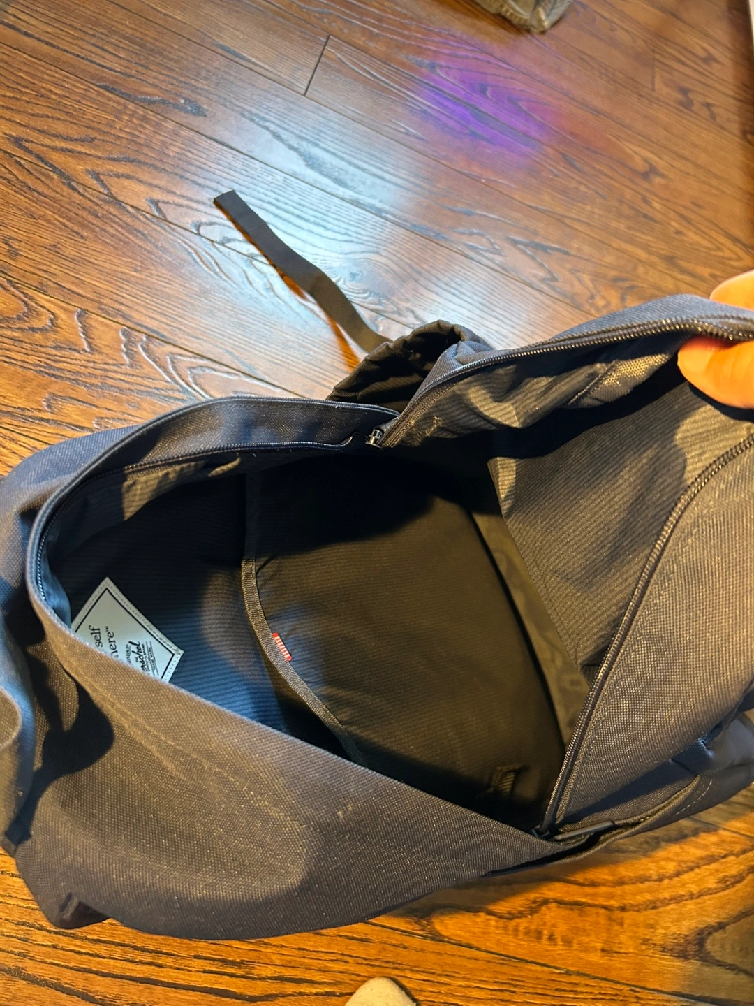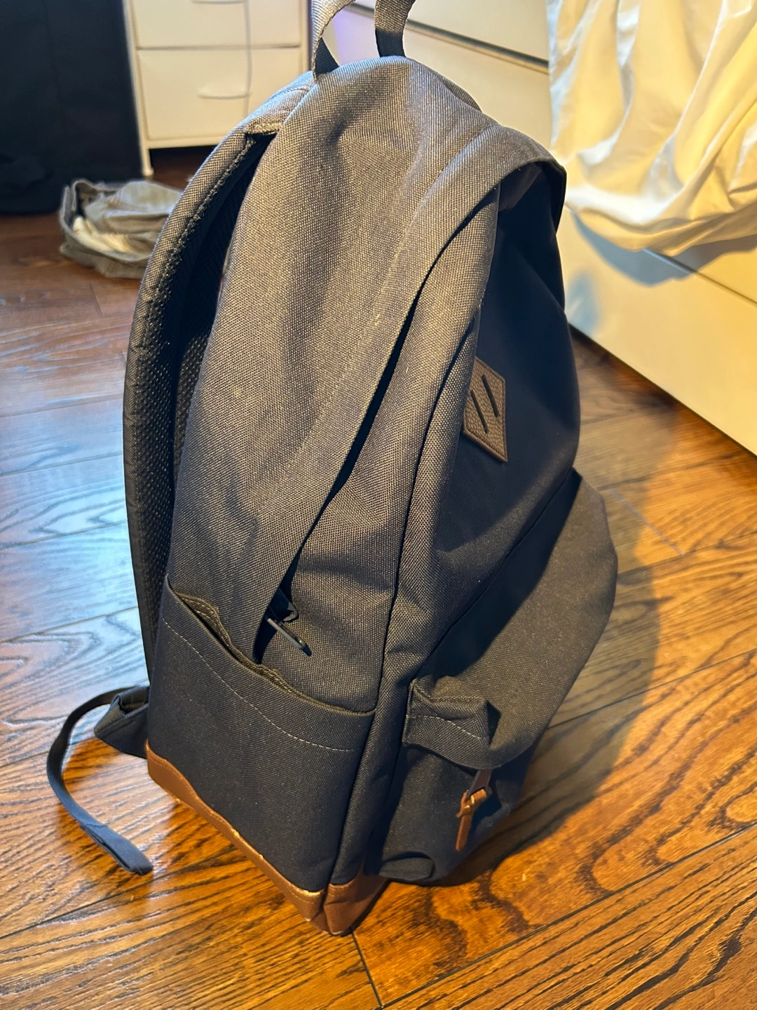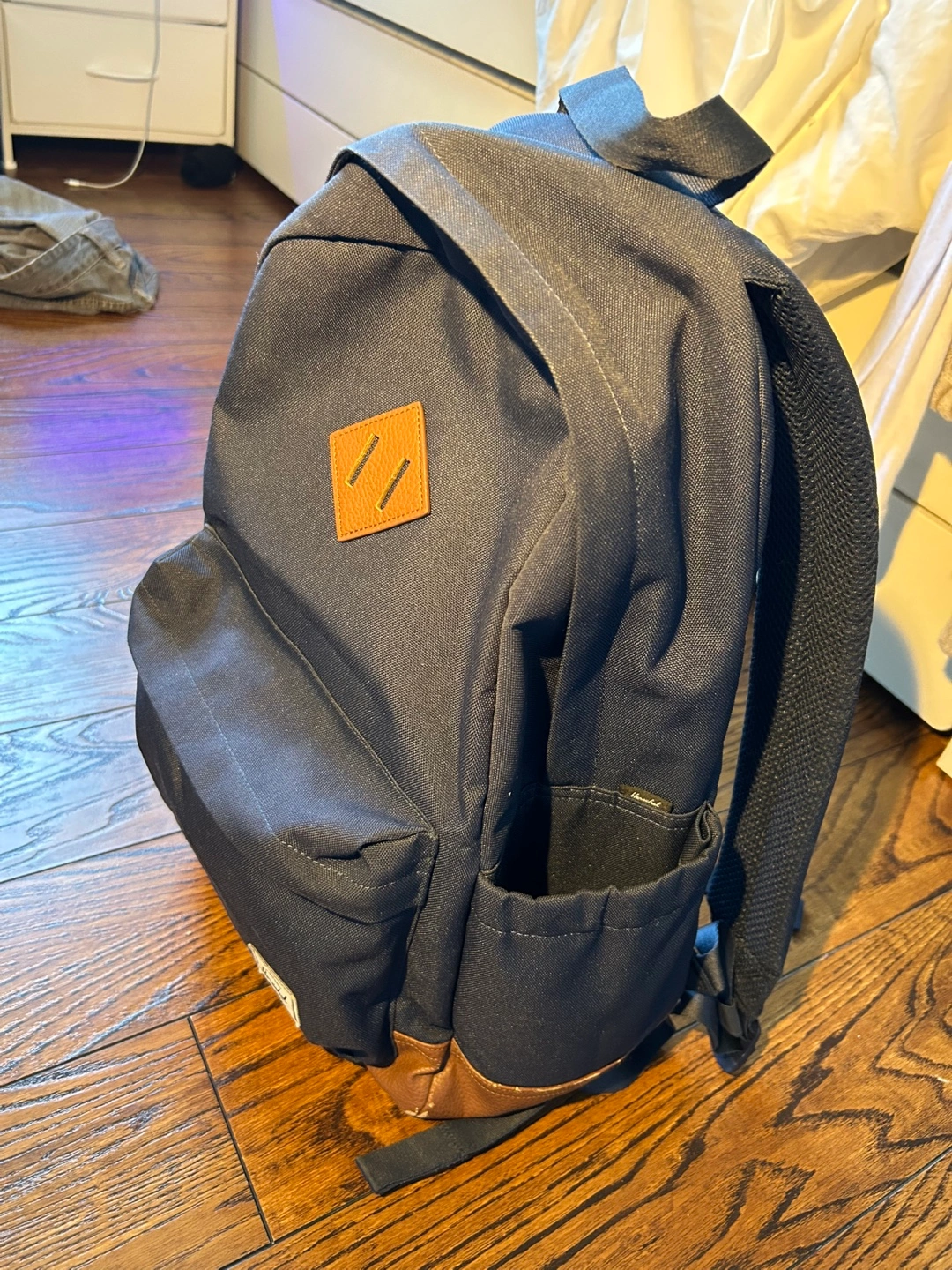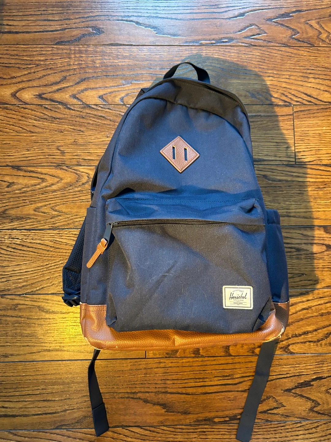 Selling a Herschel backpack in navy blue with a brown leather bottom. There's some wear and tear on the leather at the bottom, as shown in the photos, but otherwise, it's in great condition! Great for school or everyday use. The only reason I’m selling is because I need a bigger one for back to school.