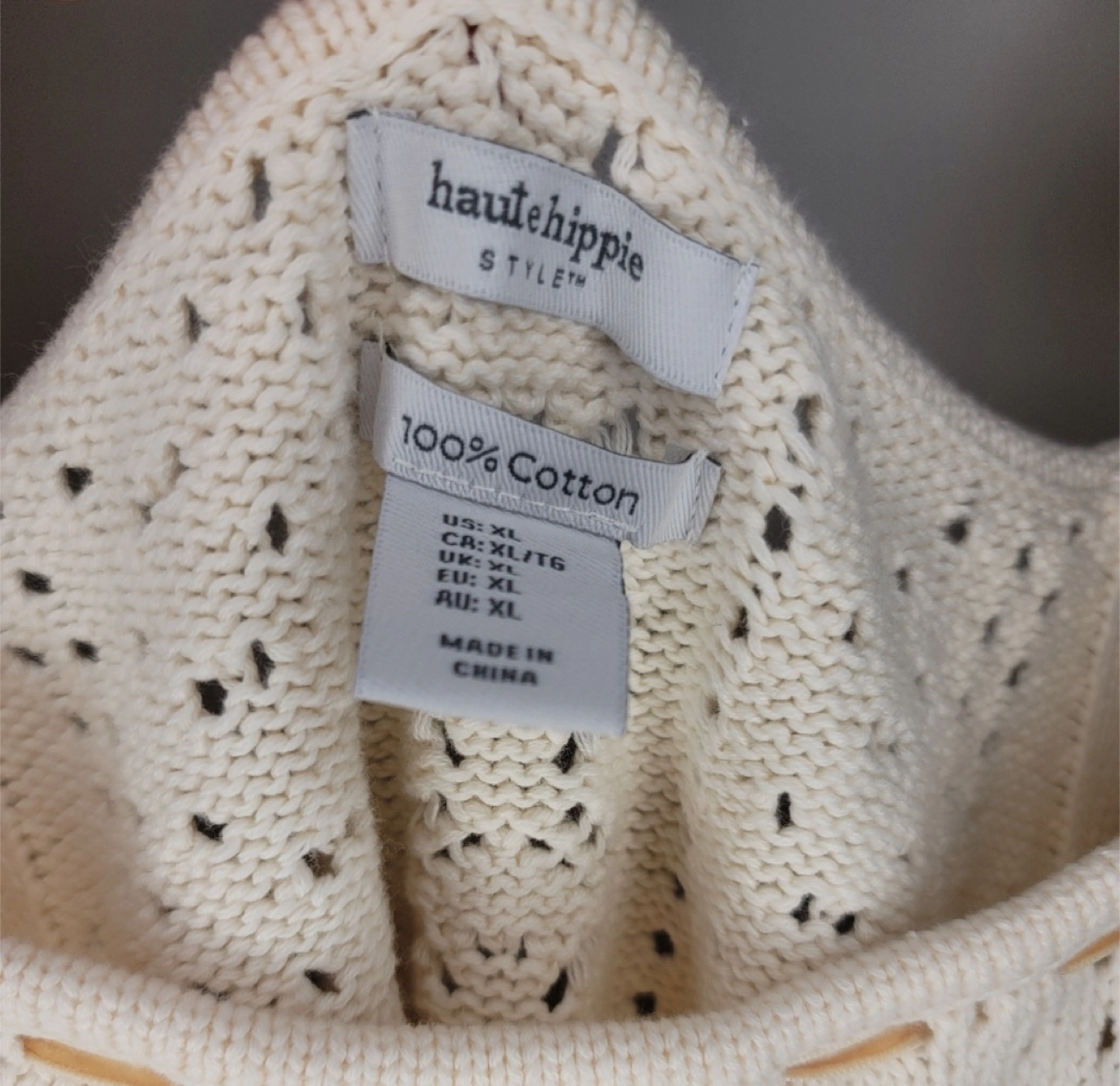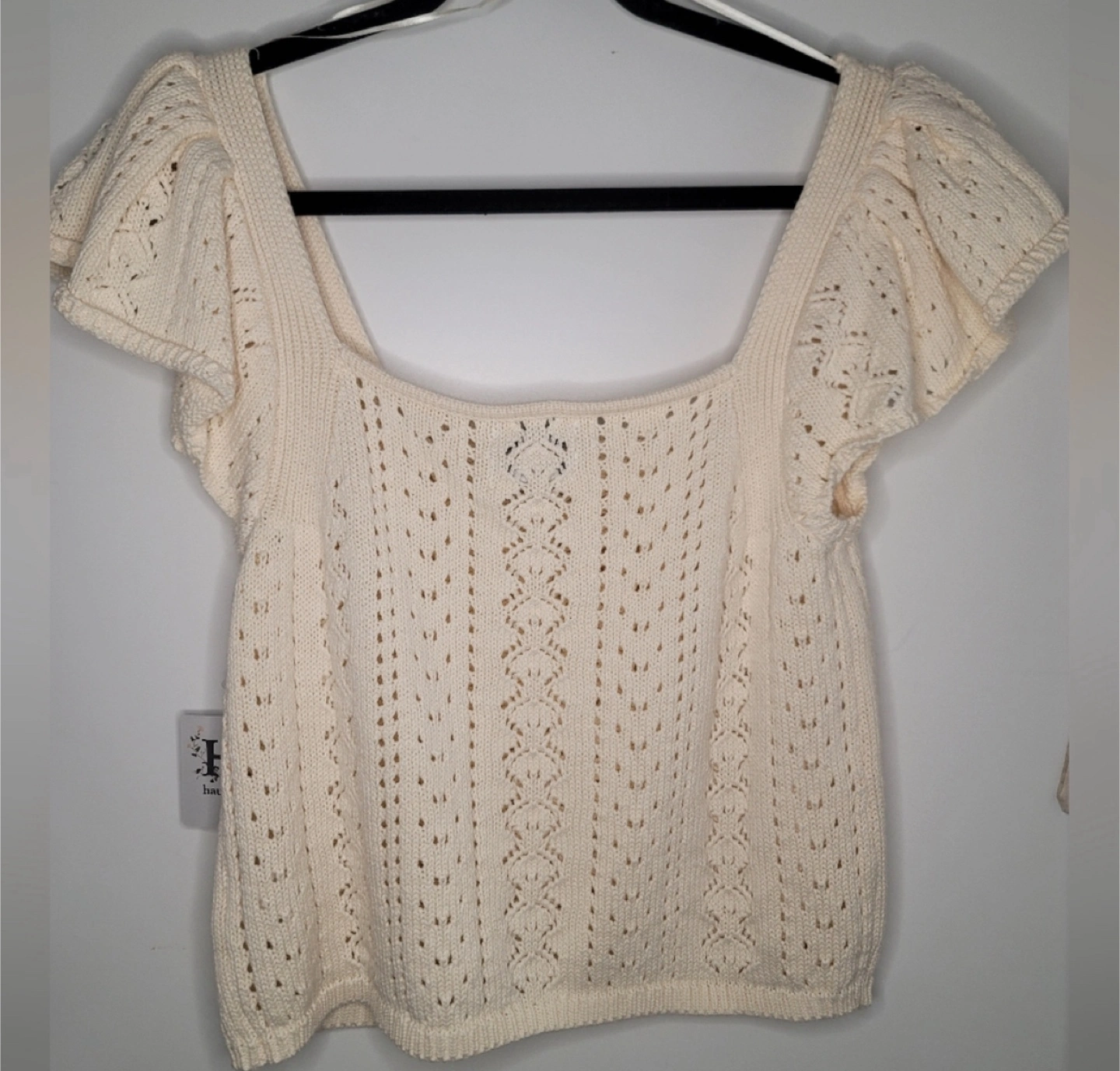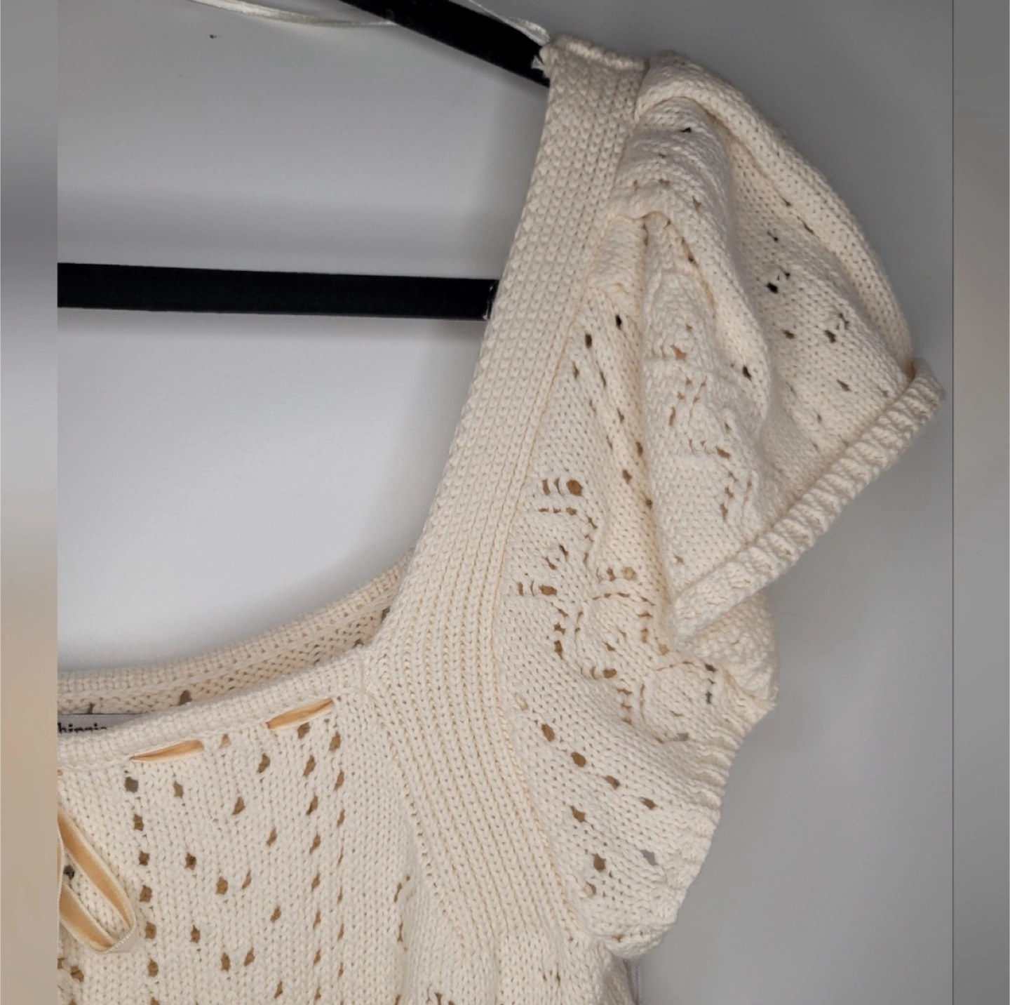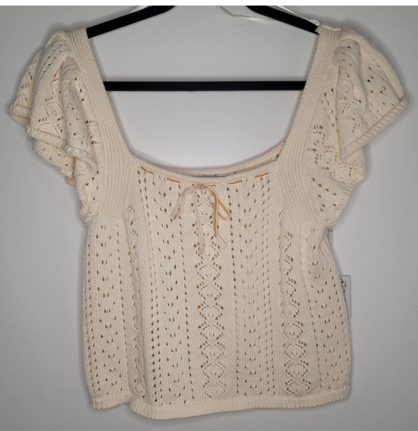 Fashion luxury brand in New York. Chic cream knit top with short flutter sleeves. Features a delicate pattern and velvet tie detail. square neckline loose body unlined 100% cotton boho, bohemian , country chic, cottagecore This is in new condition, new with tags. Cash preferred or etransfer Porch pick locations: Markham - Markham Rd & 16th Ave Oshawa - Wilson Rd & Adelaide Ave Pls feel free to ask me any questions
