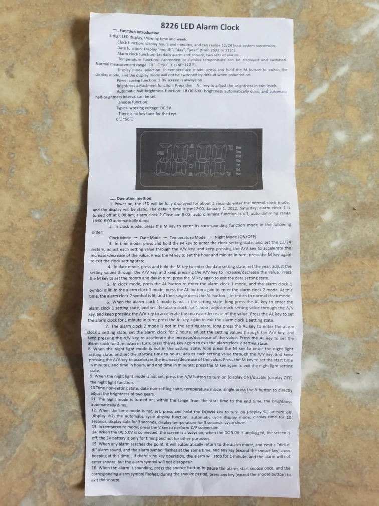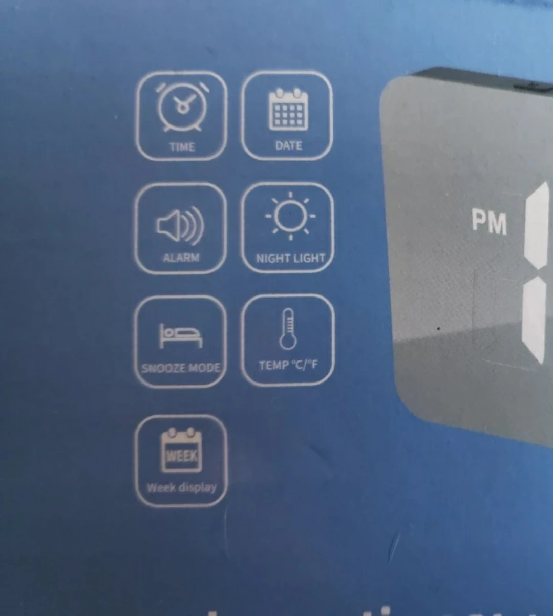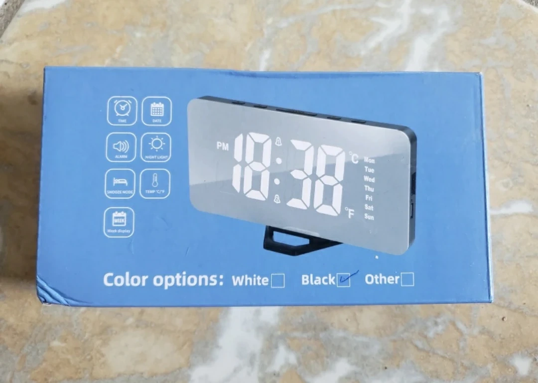 It displays the time, date, and week. It also has alarm and snooze functions, as well as a night light. The box and the USB cable included. It can display temperature in both Celsius and Fahrenheit.