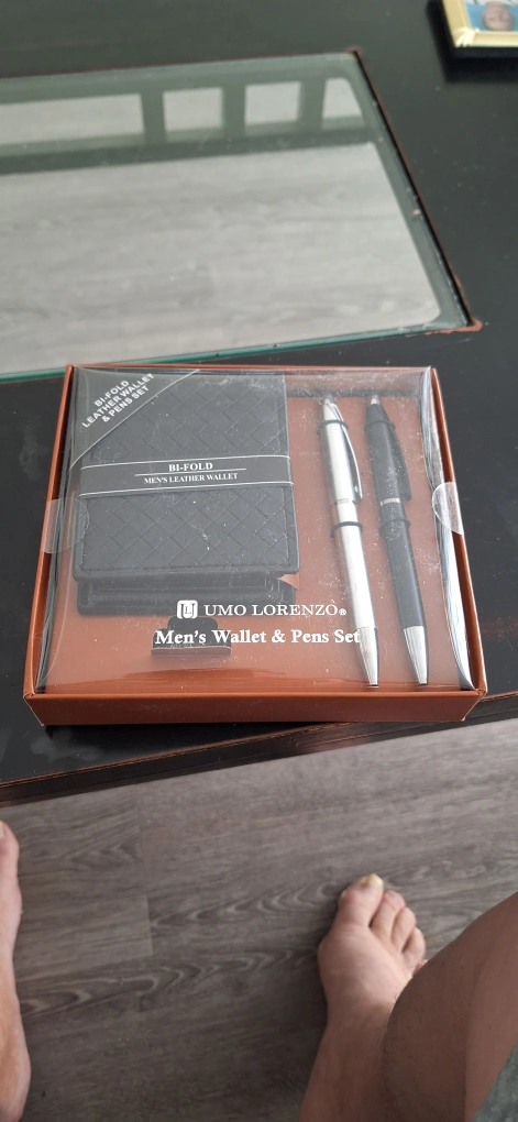 Selling a brand new UMO Lorenzo men's wallet and pens set! It's still in the original packaging and includes a bi-fold leather wallet and two pens. Perfect as a gift!