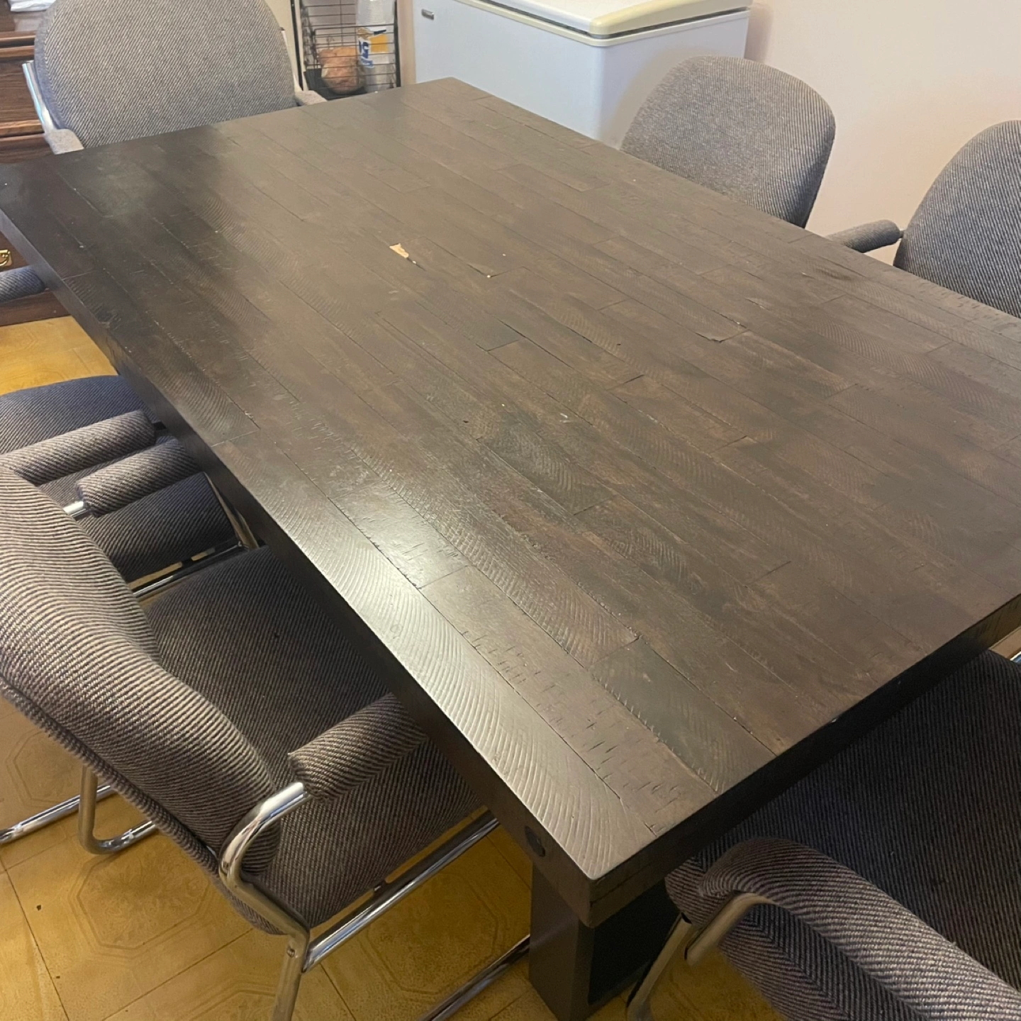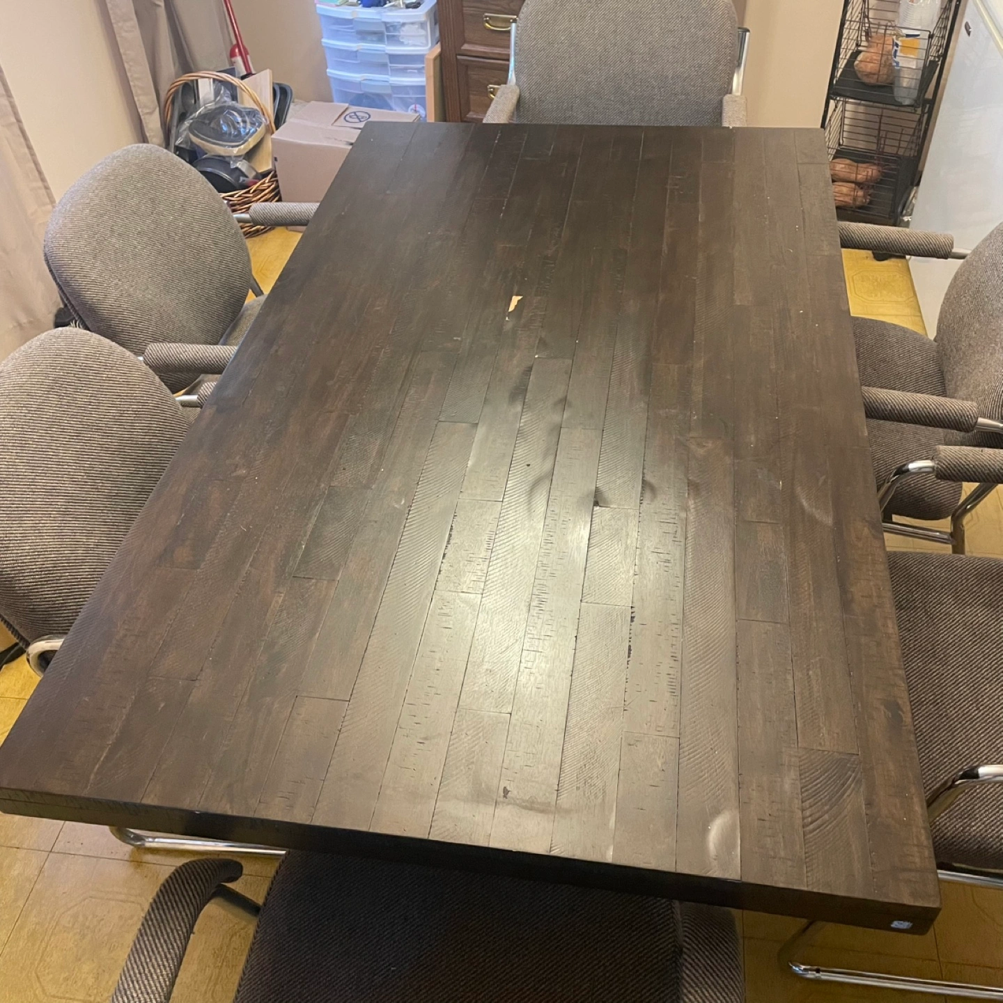 Selling a dining table with six chairs. The table is a dark wood colour and the chairs are upholstered in a grey fabric. A great set for family dinners or entertaining guests! It’s in good condition.