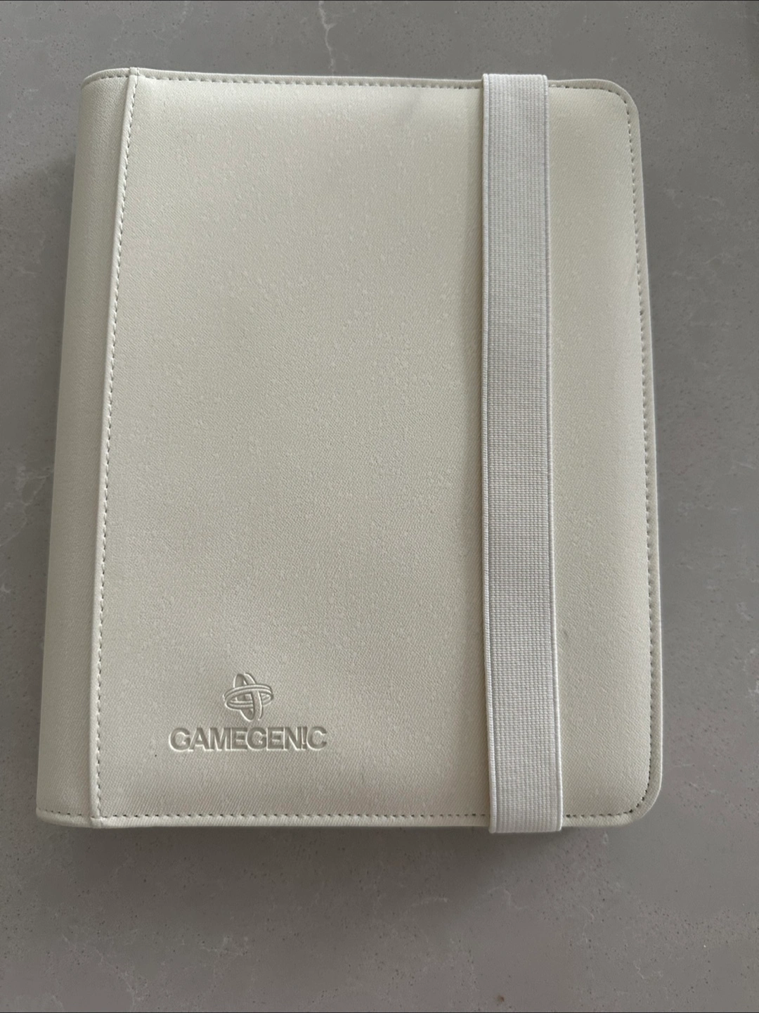 Selling a Gamegenic card binder in white. It's in great condition and perfect for storing your cards. It features an elastic strap to keep it closed and secure.