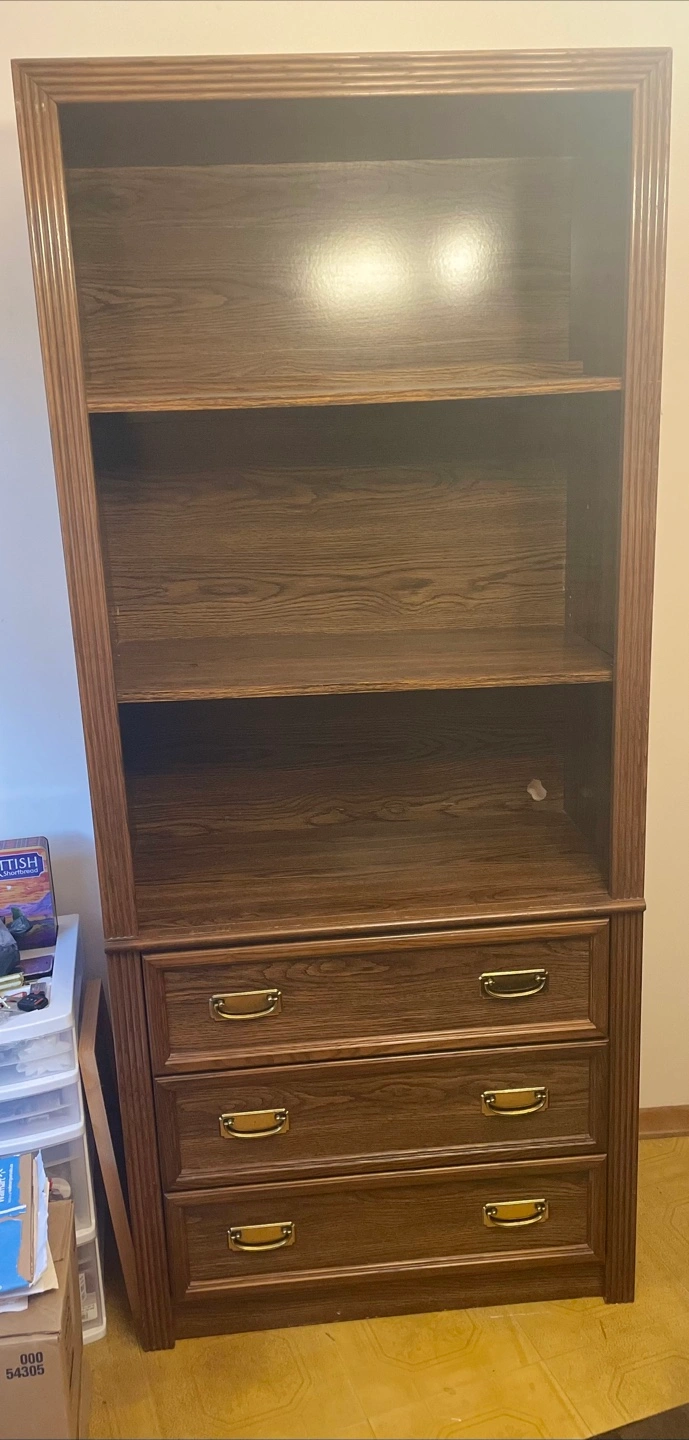 Selling a wooden bookcase with three drawers at the bottom. It's in good condition and would be great for storing books or displaying items in your living room or office