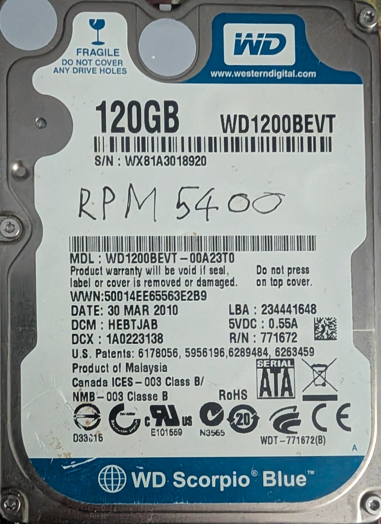Selling a WD Scorpio Blue 120GB hard drive. It's a 5400 RPM drive, model WD1200BEVT. Manufactured in 2010 March 30. fully functional for everyday use.