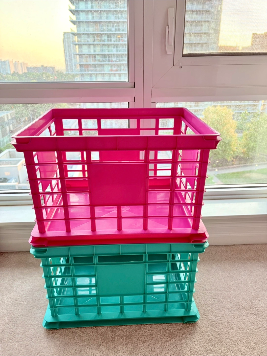 Pink and teal colour stackable crates Gently used but in excellent condition 16 1/2 L 13 W 10 1/2 H
