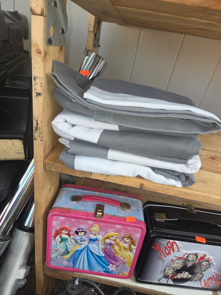 Selling a cute vintage Disney Princess lunchbox! It features Ariel, Snow White, Cinderella, Aurora, and Belle. Perfect for a collector or a Disney fan.h.m i was trying to list the 4 Grey and white curtains for 30$ and I may as well say the korn,,yes korn lunchbox is also for grabs for 20$.