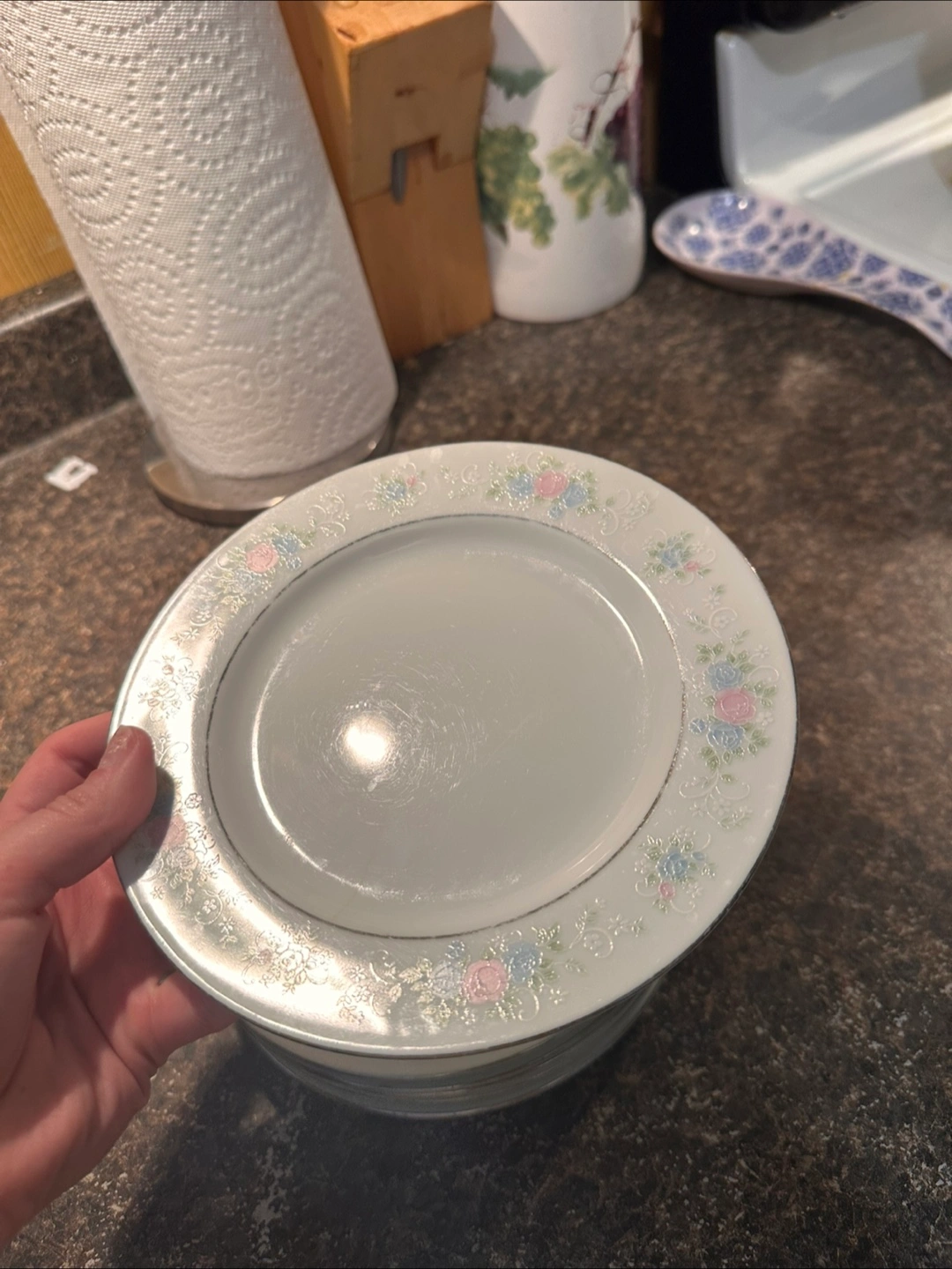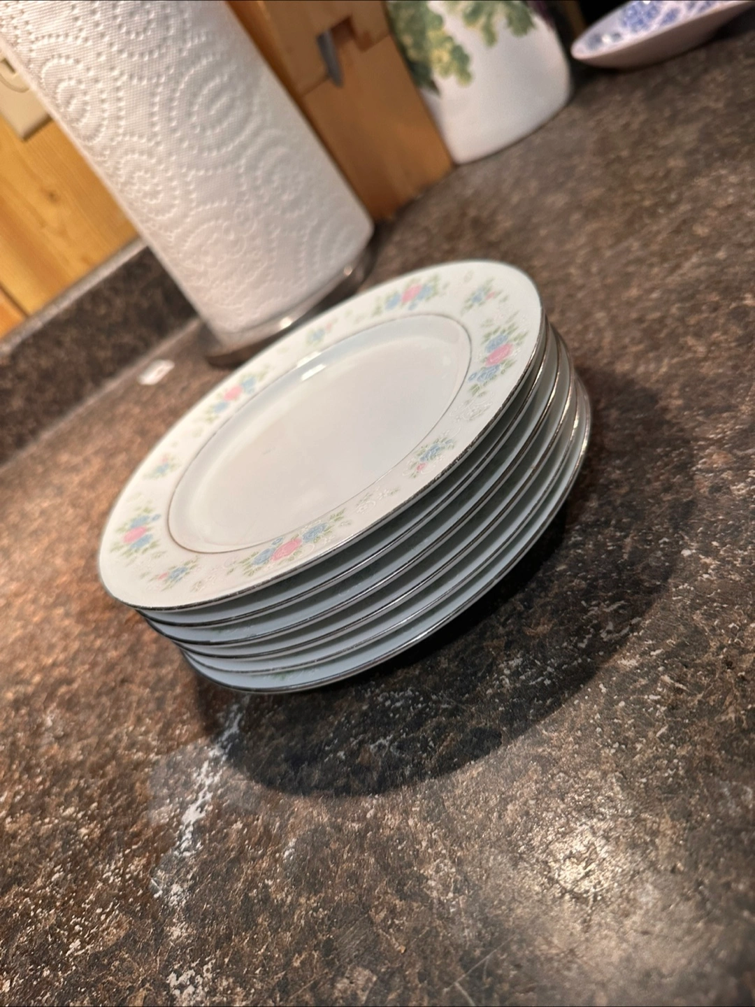 Selling a set of dinner plates with a delicate floral pattern. They're in good condition and ready for a new home! Perfect for everyday use or special occasions