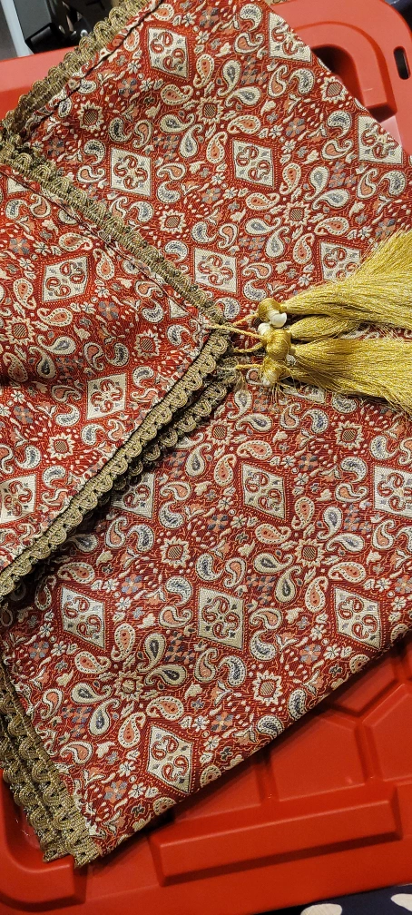 This is a beautiful table cloth with a red paisley pattern and gold tassels. It would look great on any table!