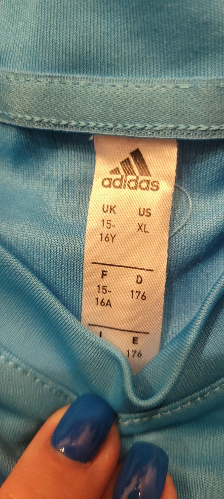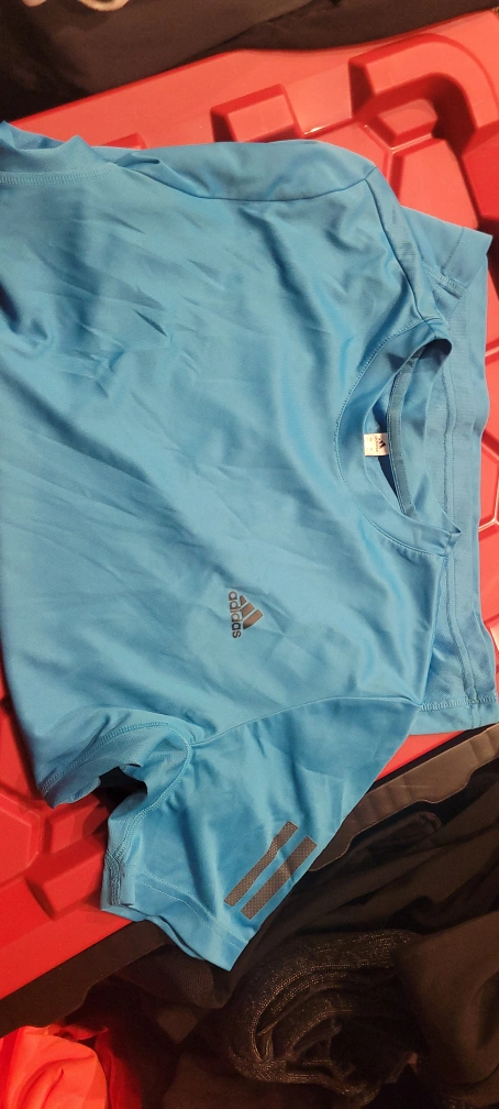Selling a light blue Adidas training shirt in size XL. It has the classic three stripes on the sleeve. There are a few small marks on the front, but it's still in good condition for workouts or casual wear