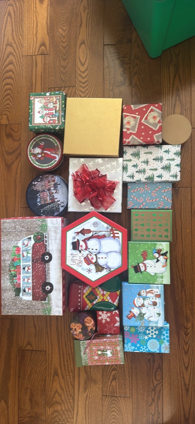 Selling a collection of 19 assorted Christmas-themed gift boxes and tins! They come in various shapes, sizes, and designs, perfect for storing holiday treats or small gifts. Great for adding a festive touch to your presents this year. Selling as a set.