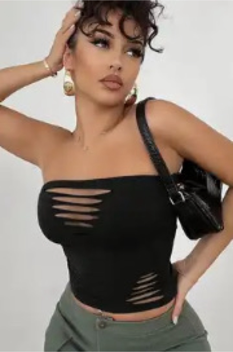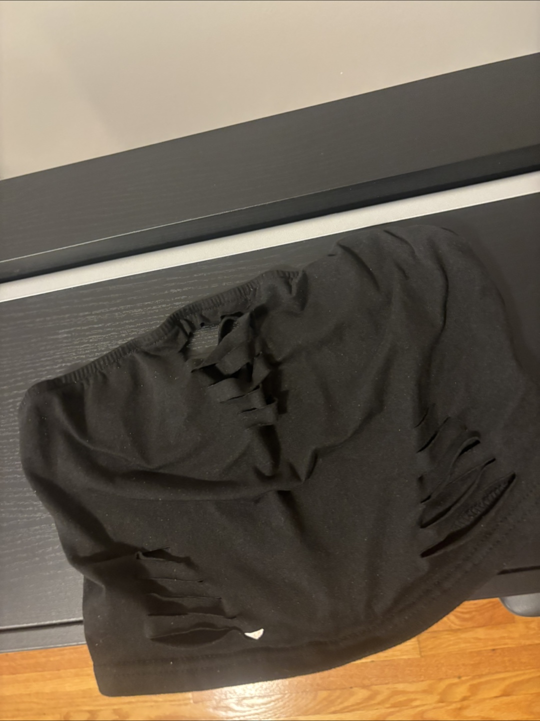 Selling a black tube top with a distressed design. It's a stylish piece that can be dressed up or down. Perfect for adding a bit of edge to your outfit!