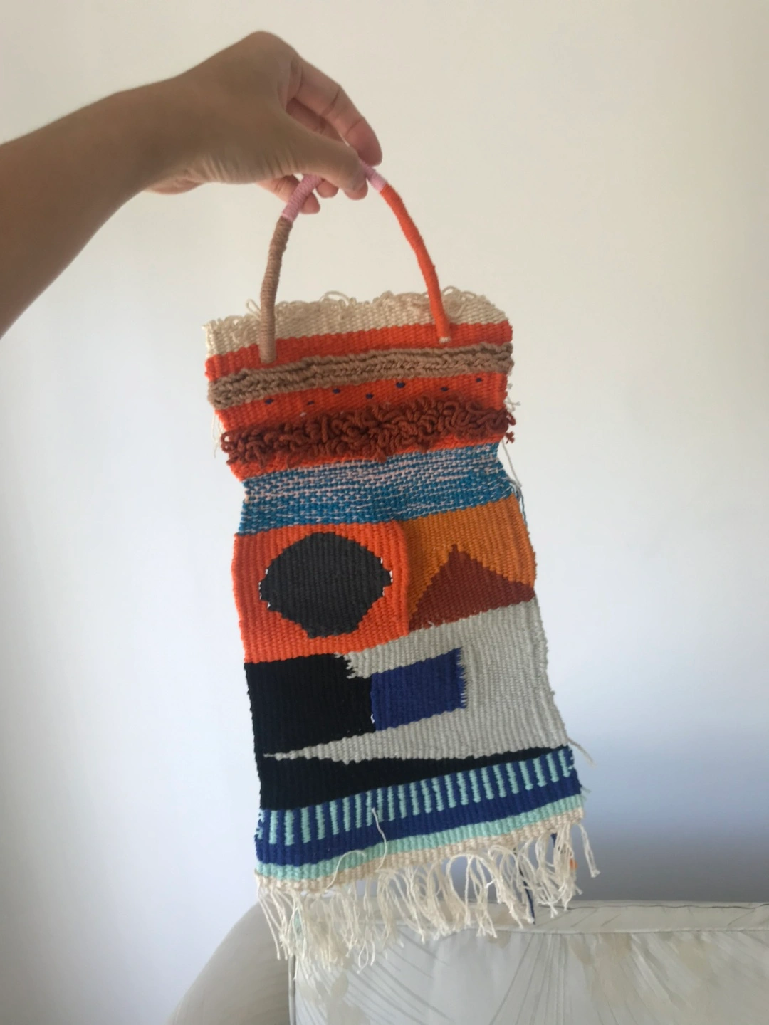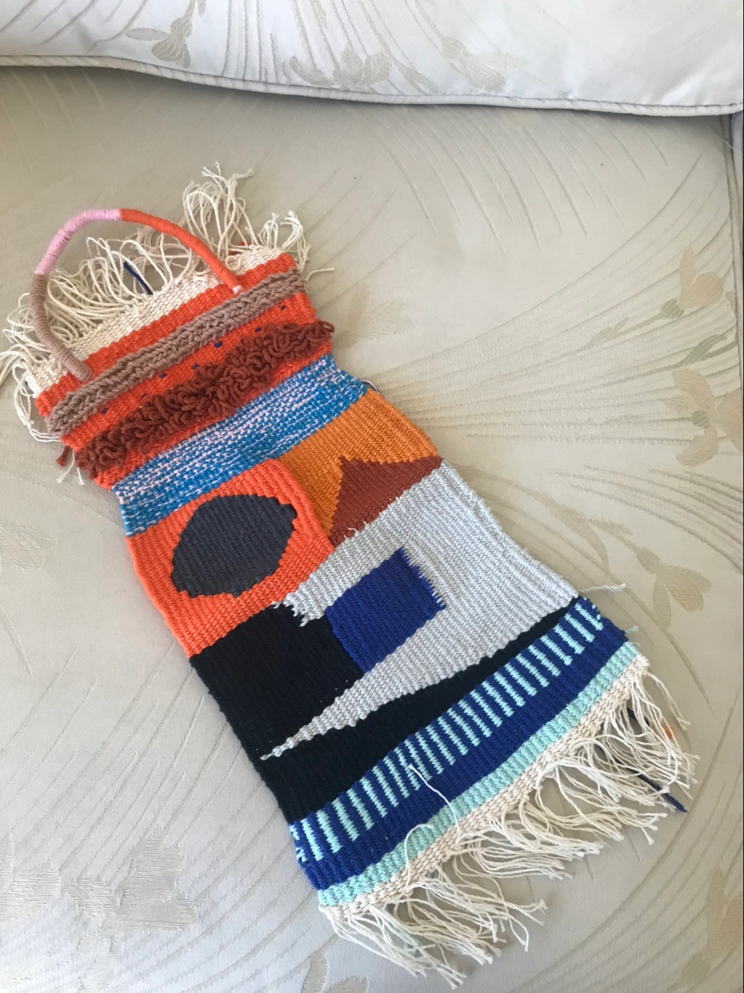 This is a unique, handmade woven wall hanging. It has a colourful design and would be a great addition to any room. I made it my self Lovely design