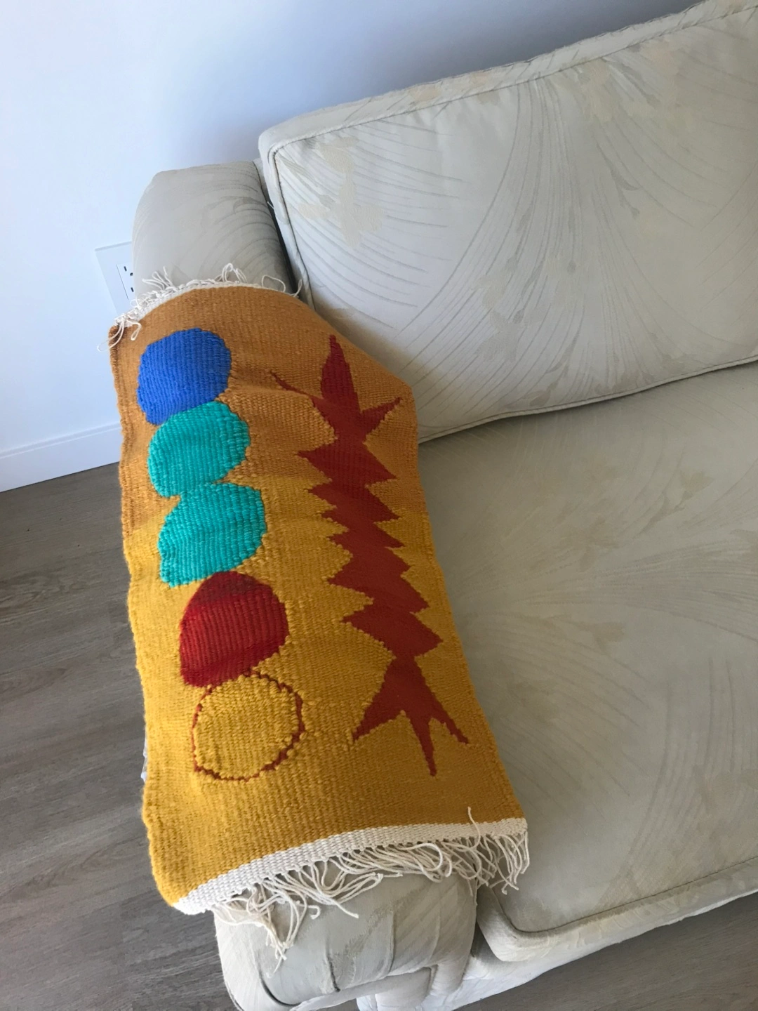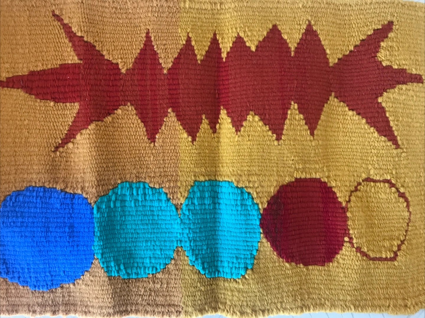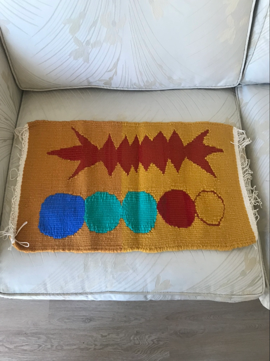 This is a unique handwoven rug featuring a striking geometric design. The rug has a warm, earthy tone with red and blue accents. It would make a great addition to any room! I made it my self Make the place that even better ^^