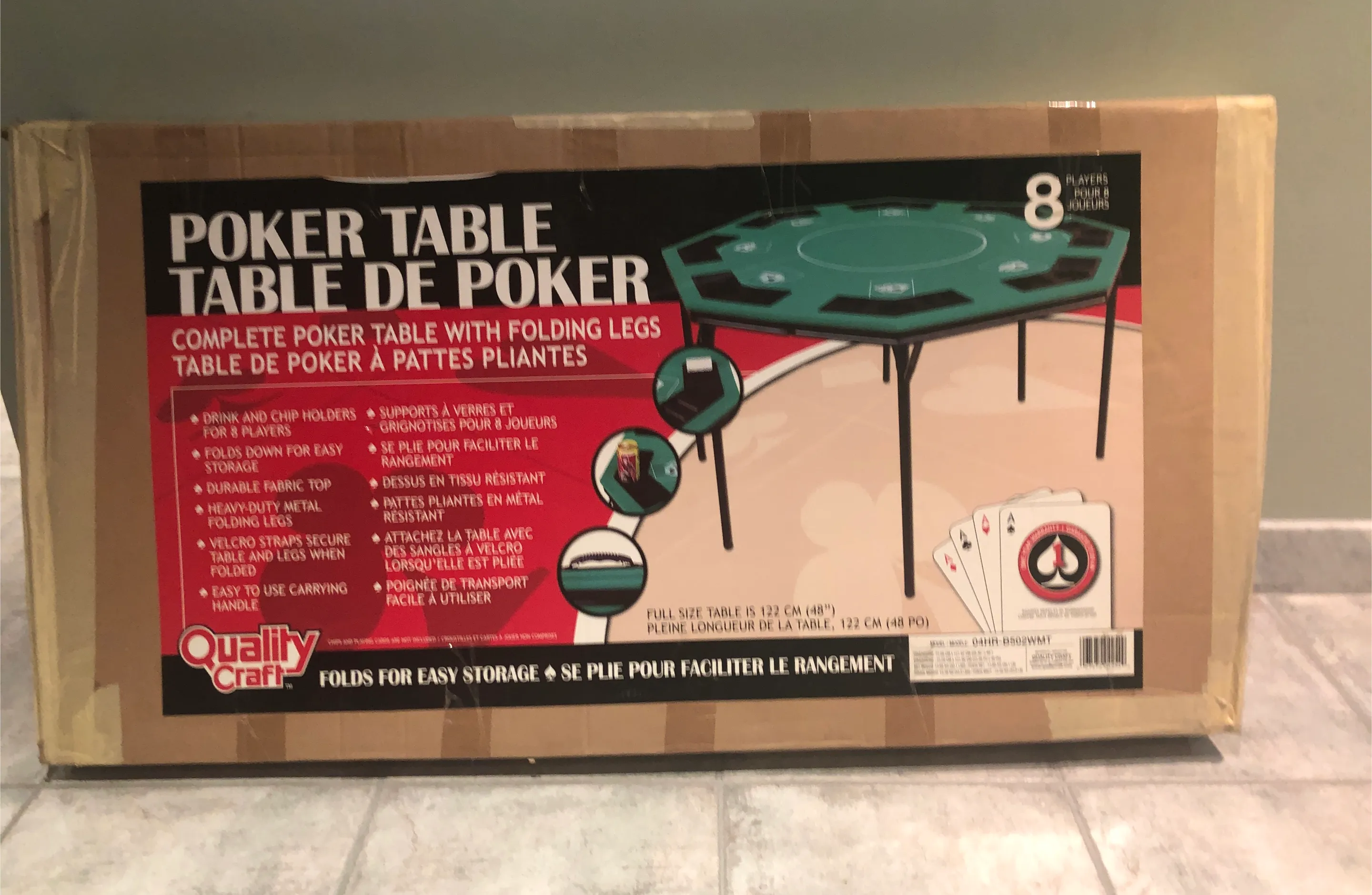 Get ready for game night with this Quality Craft poker table! It's a complete poker table with folding legs for easy storage. The table features drink and chip holders for up to 8 players, a durable fabric top, and a heavy-duty metal folding frame. It folds down easily for storage and has a handle for easy carrying. The full size is 122 cm (48 inches).