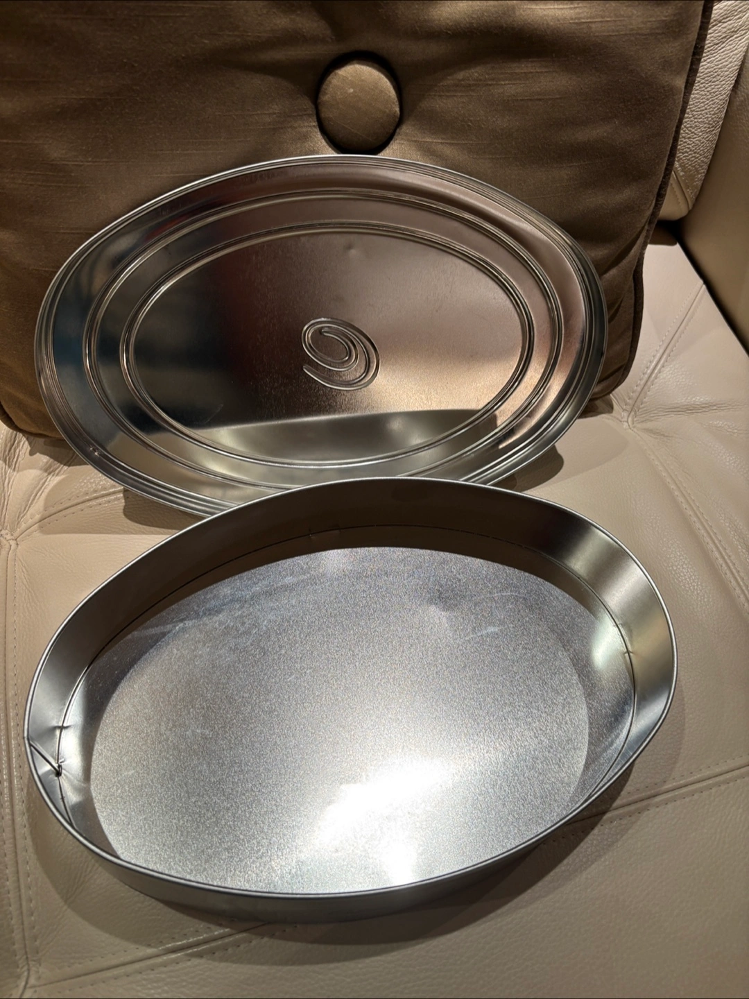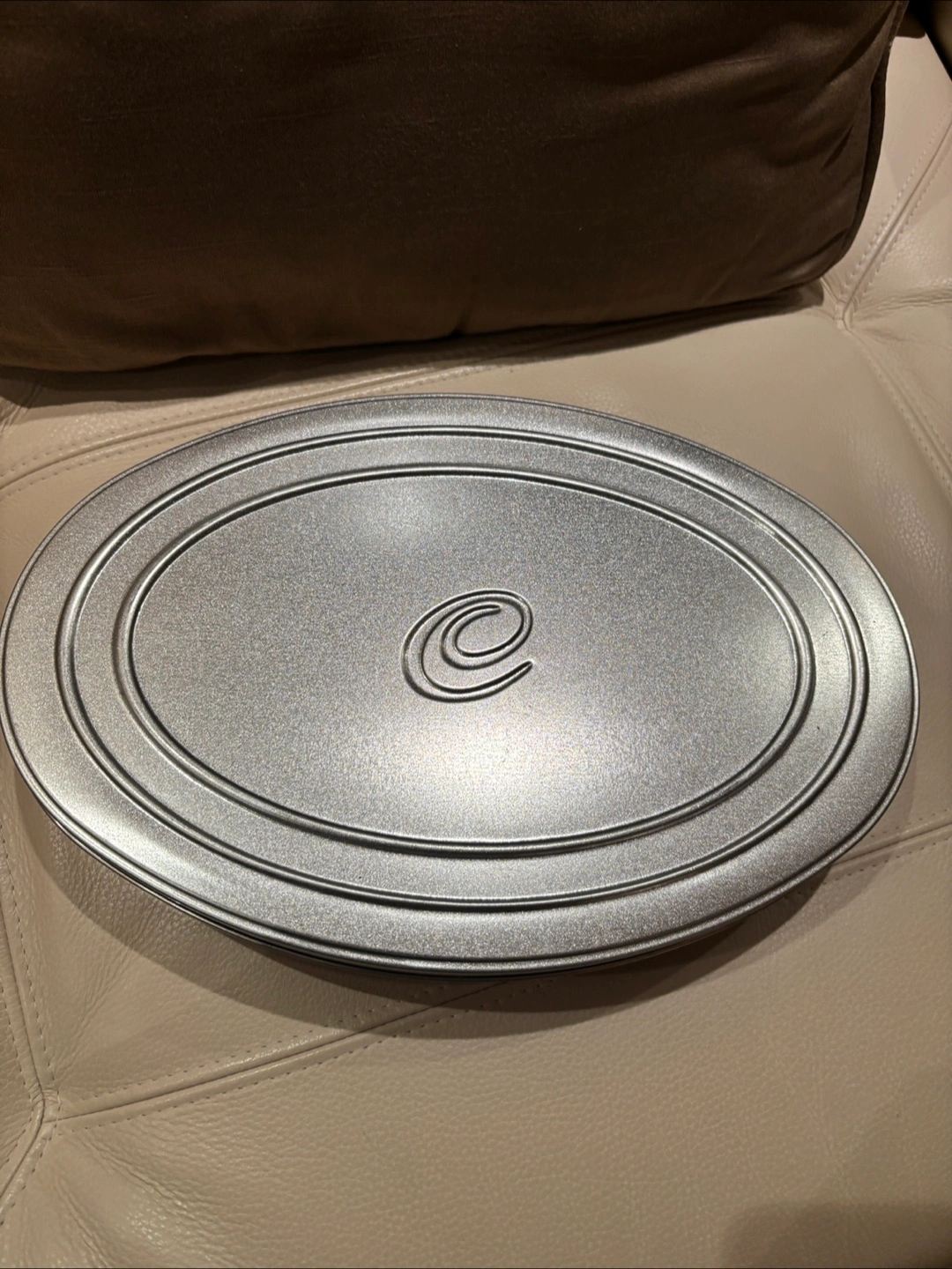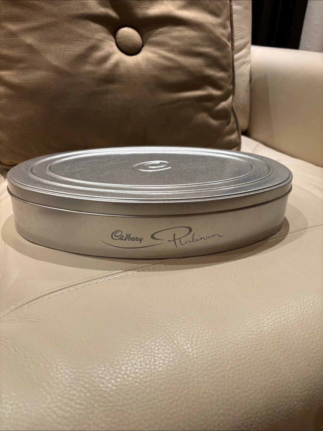 Selling a Cadbury Platinum tin. It's in great condition and perfect for storing treats or keepsakes. The oval shape is 13 inches in length, 8 1/2 at its widest and 3 inches high.
