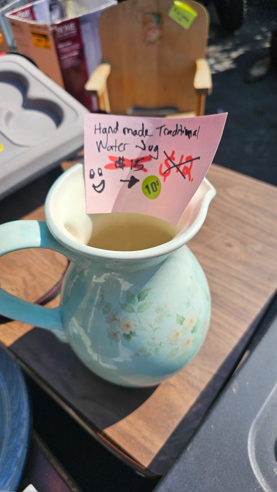 Here's a charming handmade traditional water jug up for grabs! It features a lovely floral design on a light blue background. Perfect for adding a touch of rustic elegance to your home