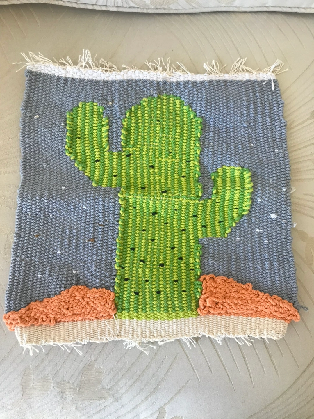 This is a cute handmade woven wall hanging featuring a cactus design. It would be a lovely addition to any room! I made it my self Make the place that even better ^^