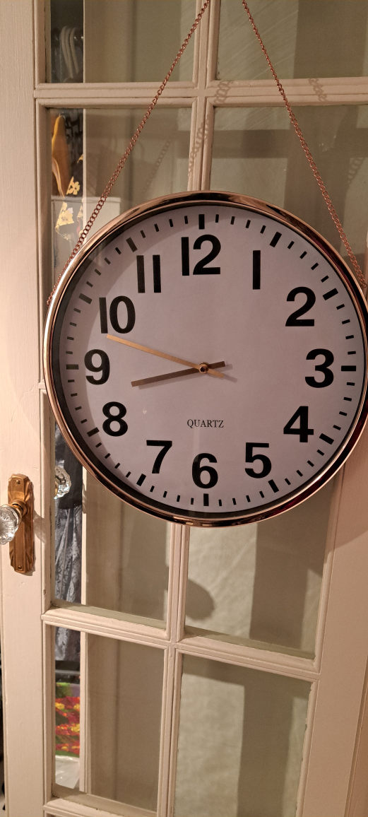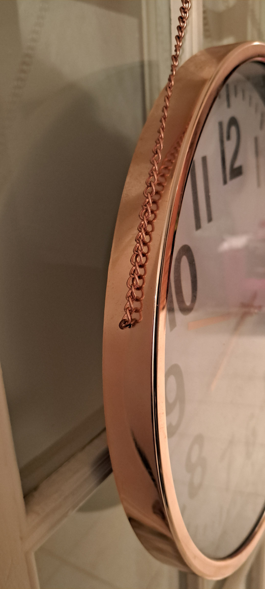 Beautiful rose gold wall clock! It's in great shape and very elegant. Has a rose gold hanging chain, and the clock face is easy to read. It's working perfectly. 15 inches.