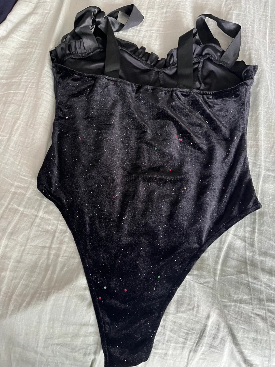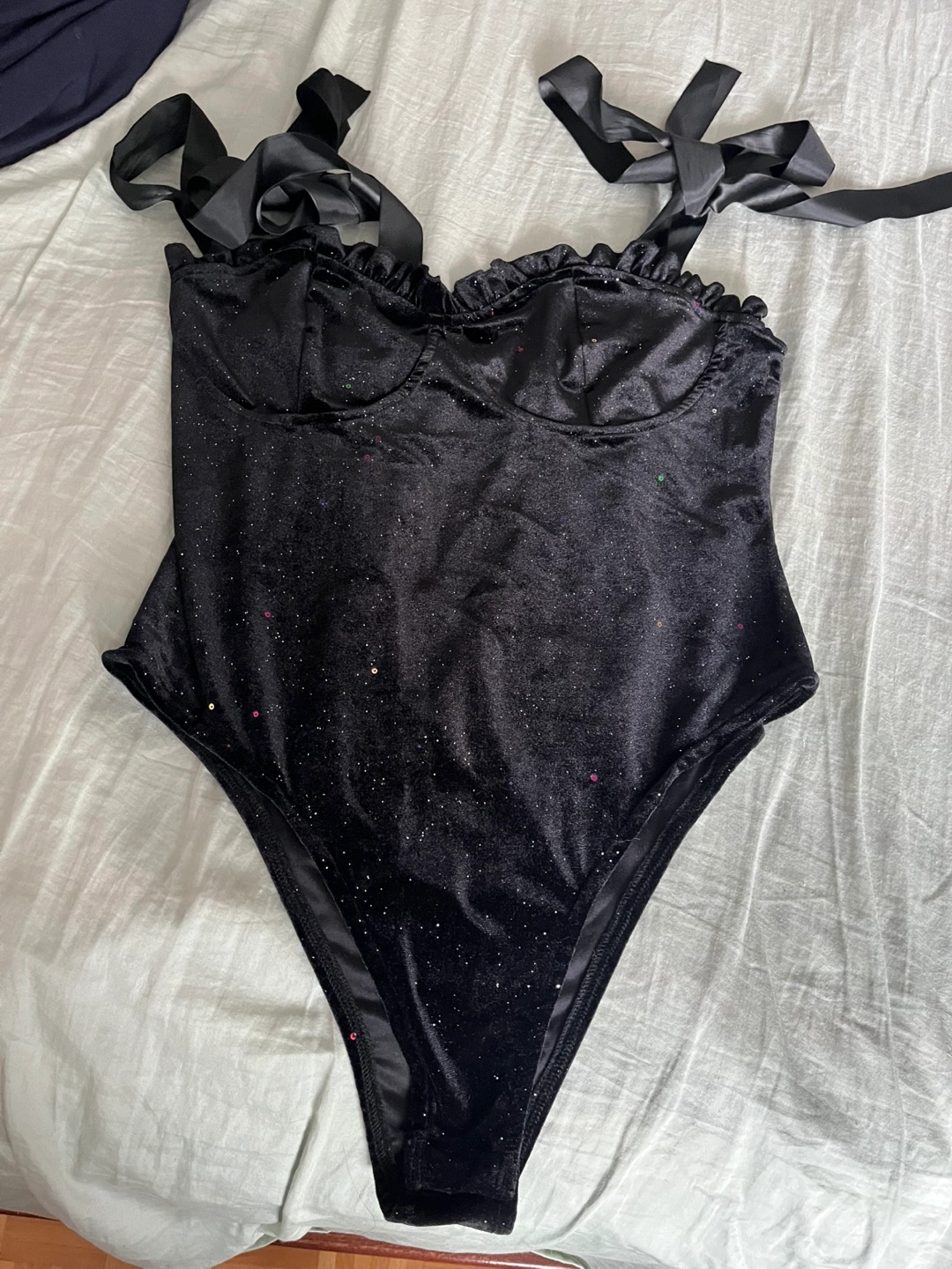 Selling a cute black velvet bodysuit. It has ribbon tie straps and a bit of sparkle throughout the fabric. Perfect for a night out!