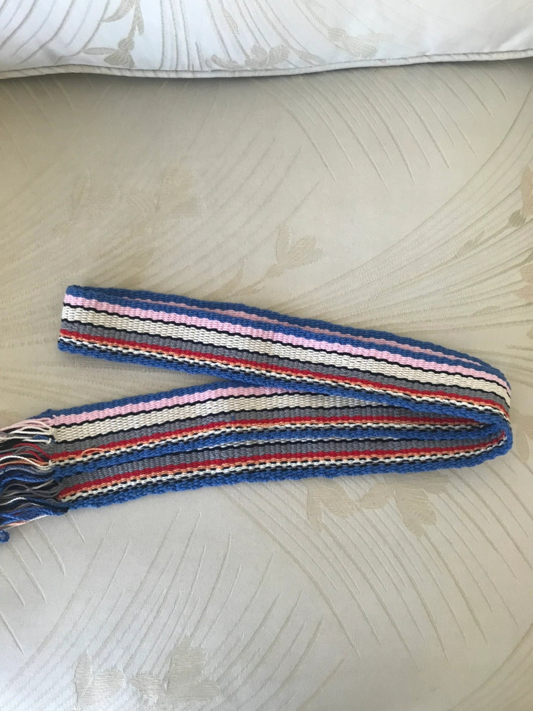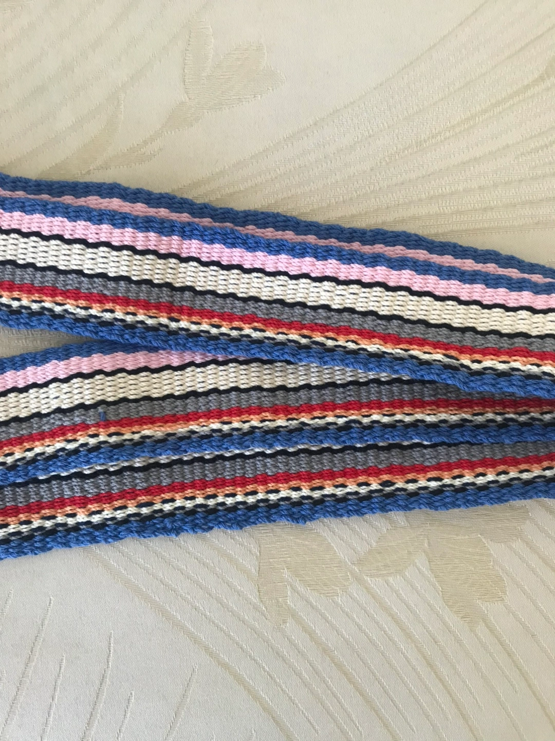 This is a handmade woven string with a colourful striped pattern. It features shades of blue, pink, white, grey, and red. It would be a stylish addition to any outfit! Put a nice strap on a normal bag. I made it my self Make the place that even better ^^