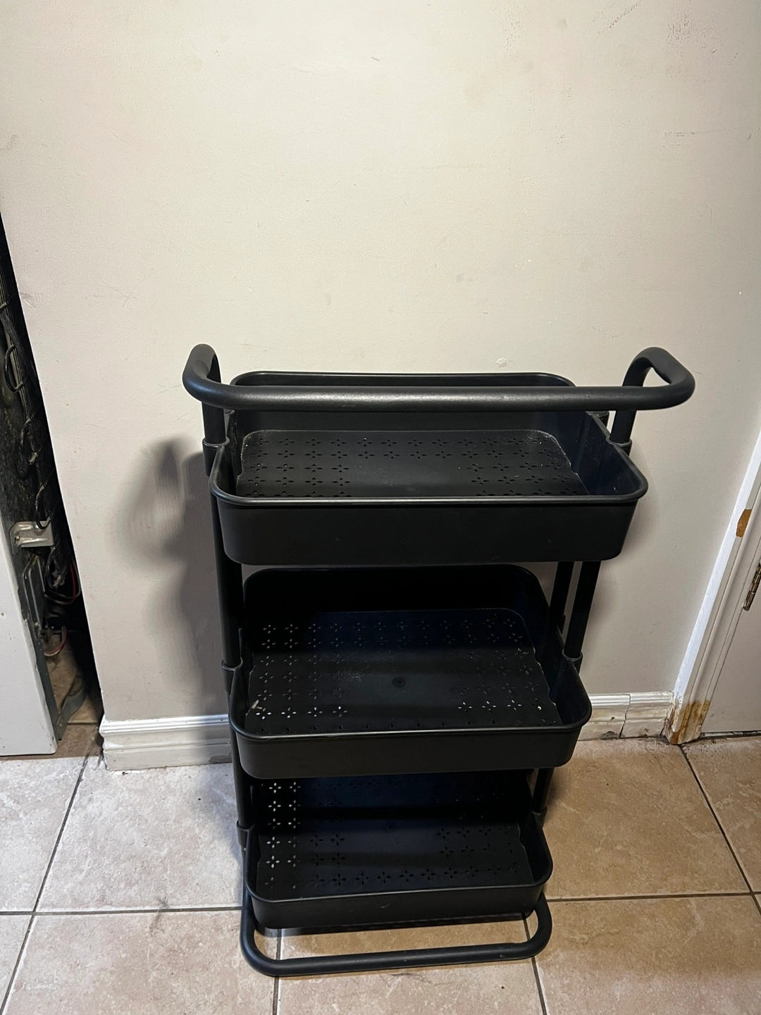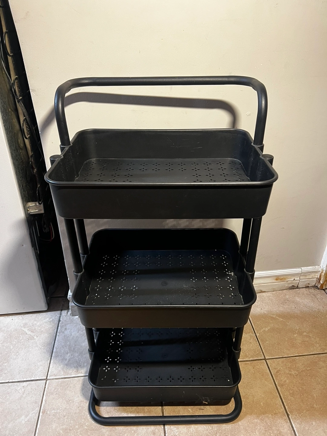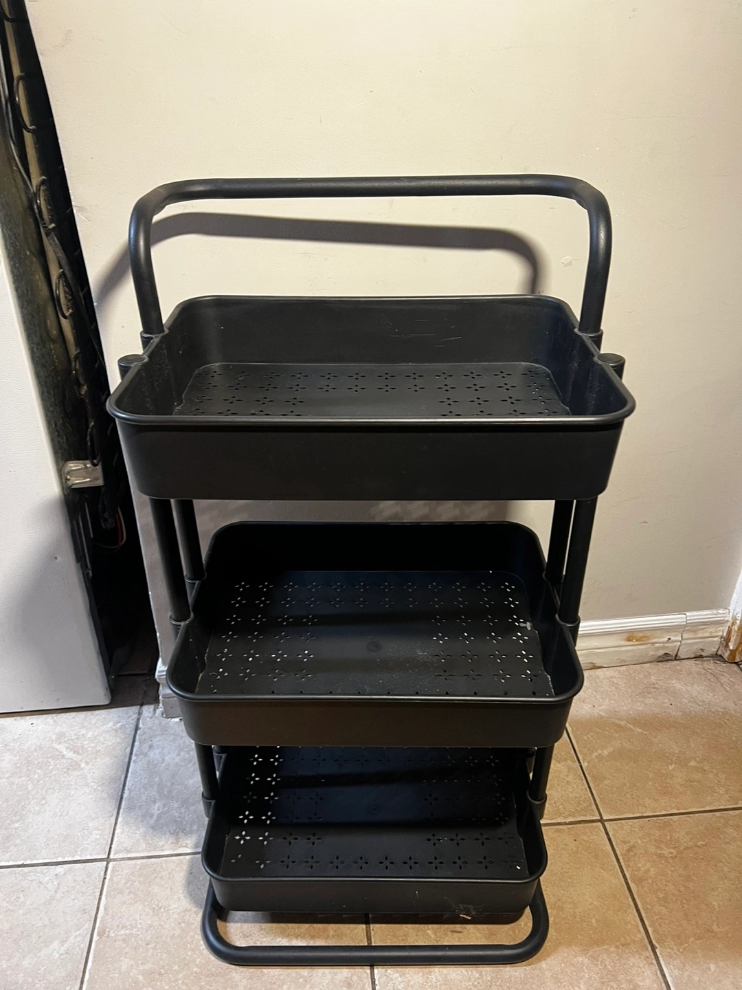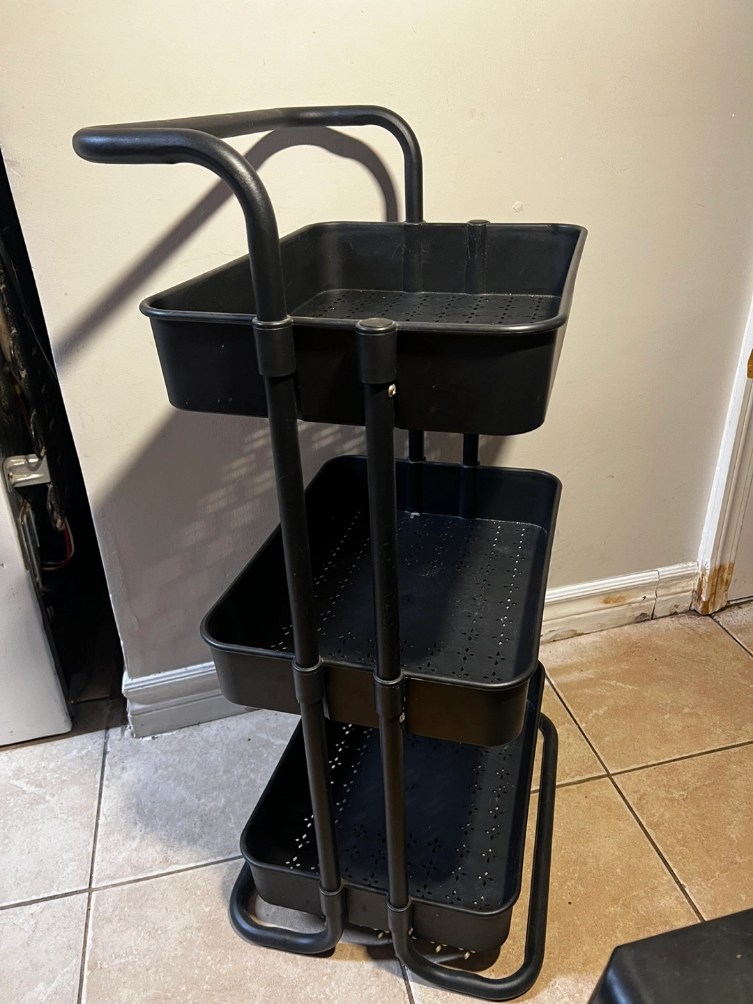 This is a handy black utility cart with three tiers! It's perfect for organizing all sorts of things around the house. Great for the kitchen, bathroom, or even as a craft cart Pick up only