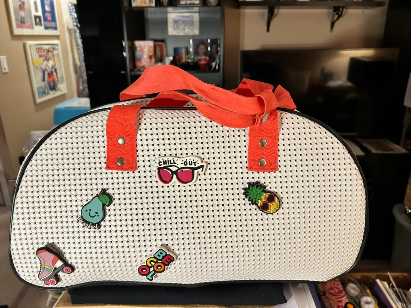 Cute white duffle bag by Eighty + Nine! It has orange straps and fun patches all over. Perfect for the gym or a weekend getaway
