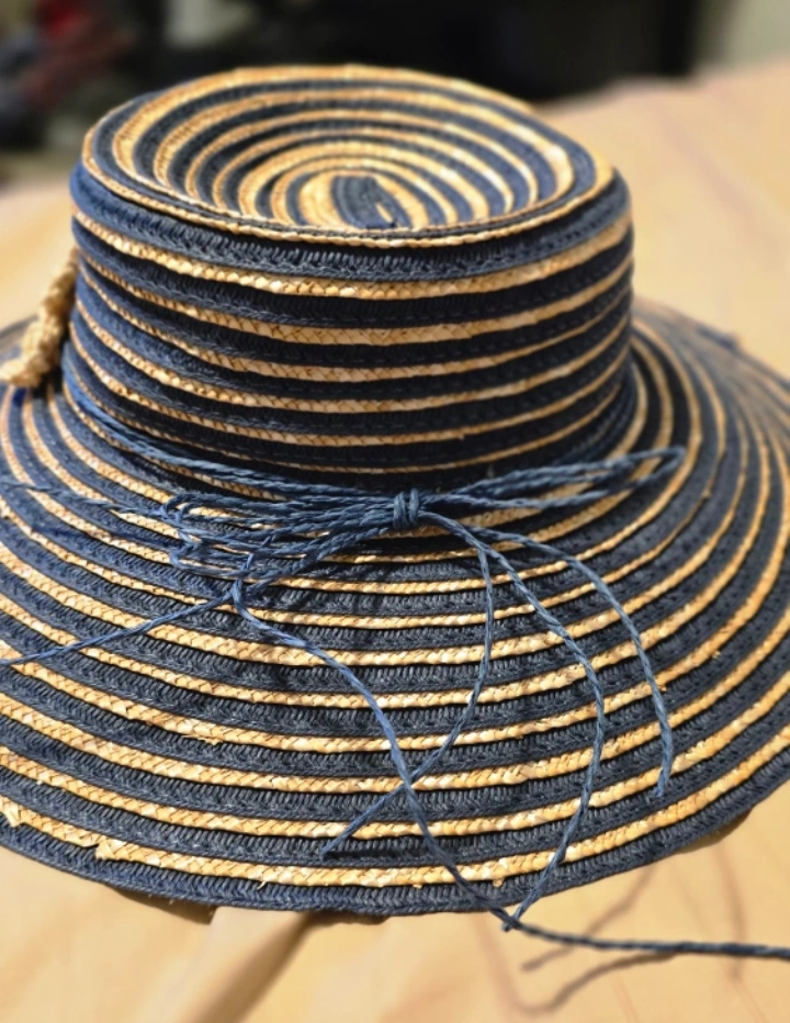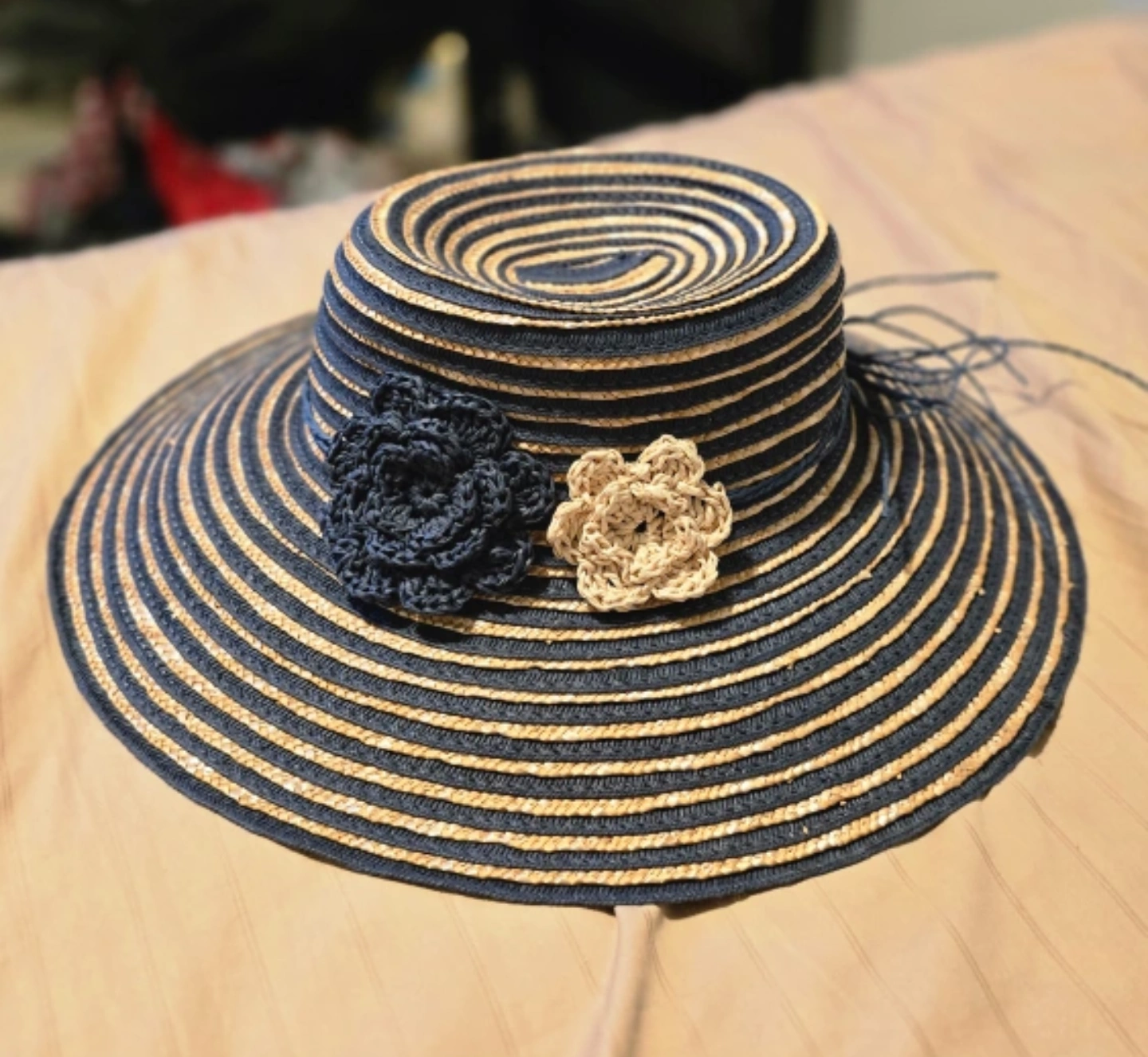 This sun hat features a stylish striped pattern in navy and beige, adorned with two cute flowers!!! It's perfect for sunny days and adding a touch of charm to your outfit!