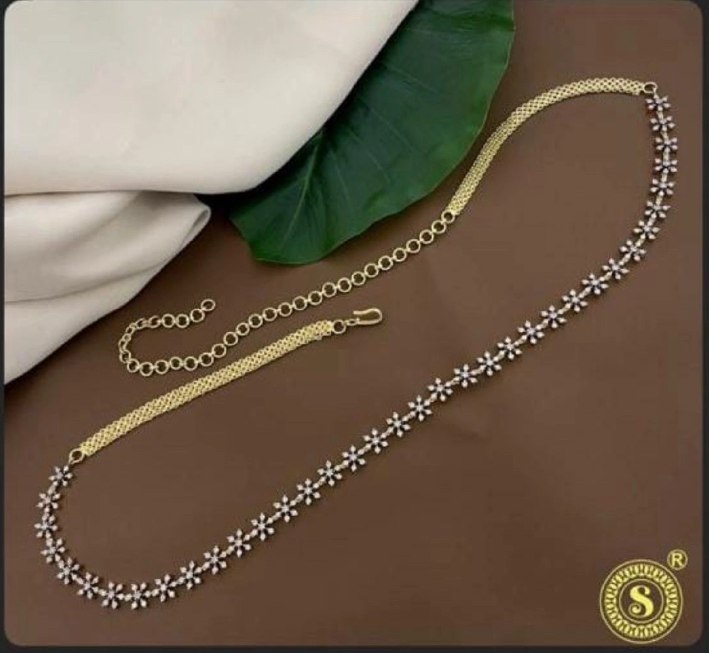 This is a beautiful gold-tone belt with a delicate flower design in white. It's perfect for adding a touch of elegance to any outfit!