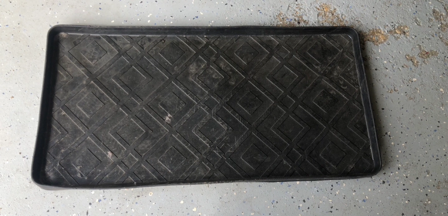 I'm selling a black rubber boot tray. It has a diamond pattern and a raised edge to contain water and dirt. It's in used condition, but still has lots of life left!
