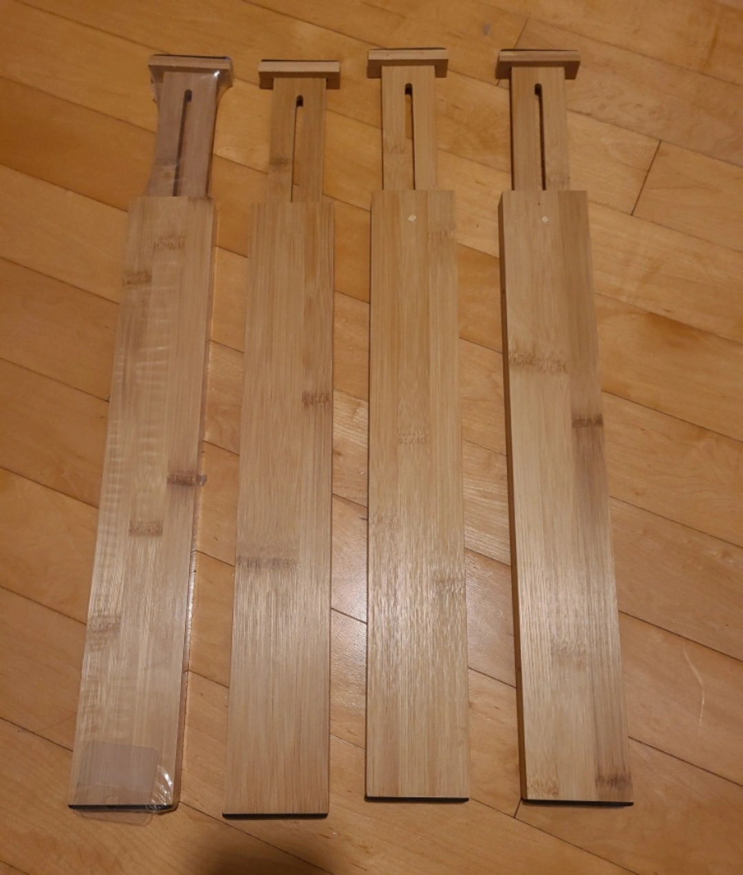 4 Bamboo dividers in new condition. Expands from 17.75 in to 22.5 in