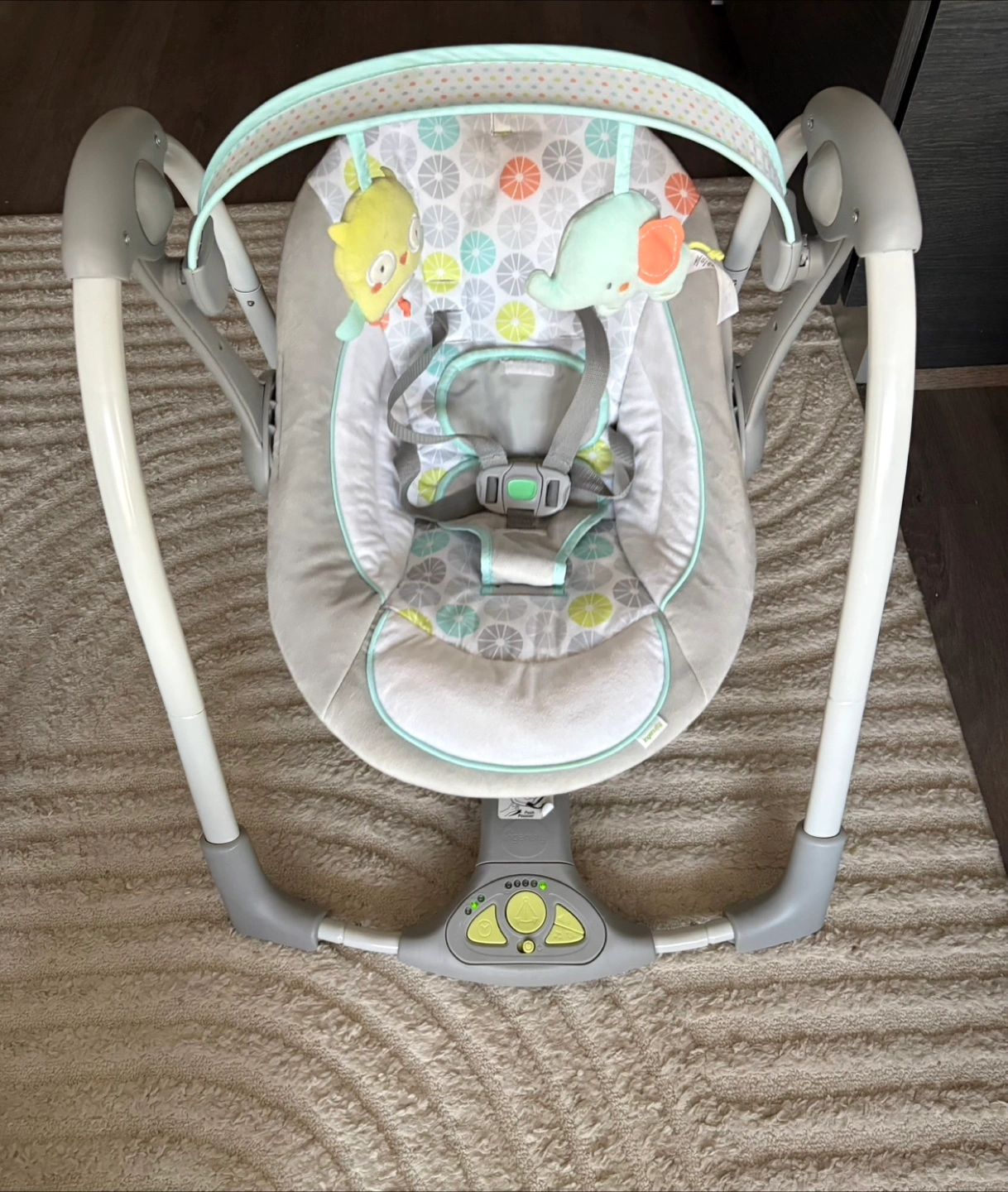 The Ingenuity Swing 'n Go is a lightweight, foldable baby swing with 5 speeds, soothing sounds, timer settings, and long-lasting battery use. It has a washable seat, removable headrest, and comes with two plush toys.