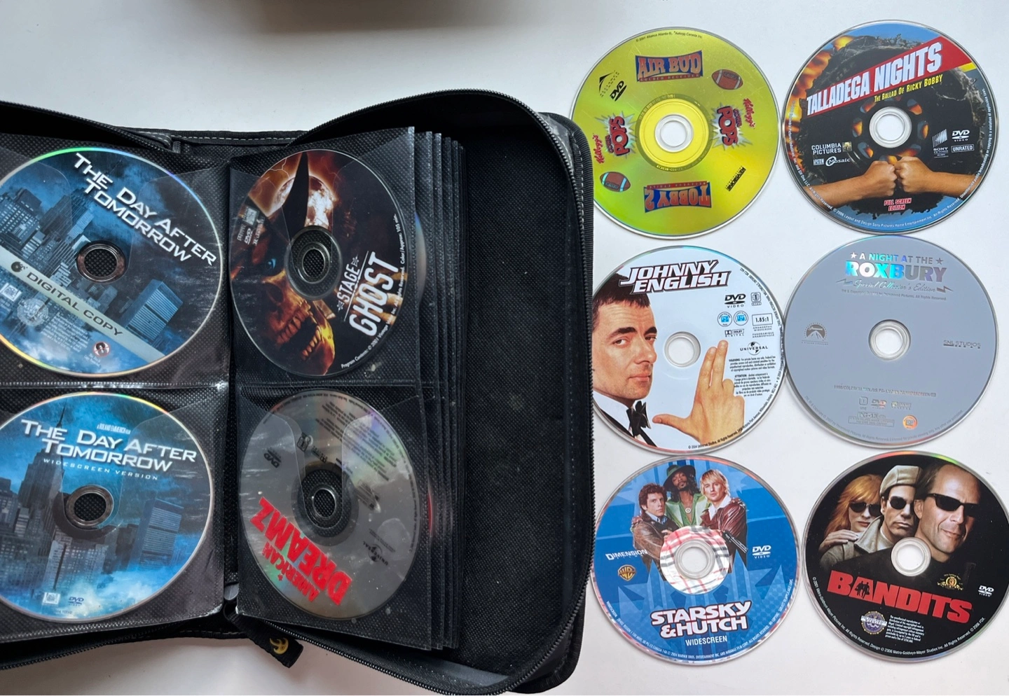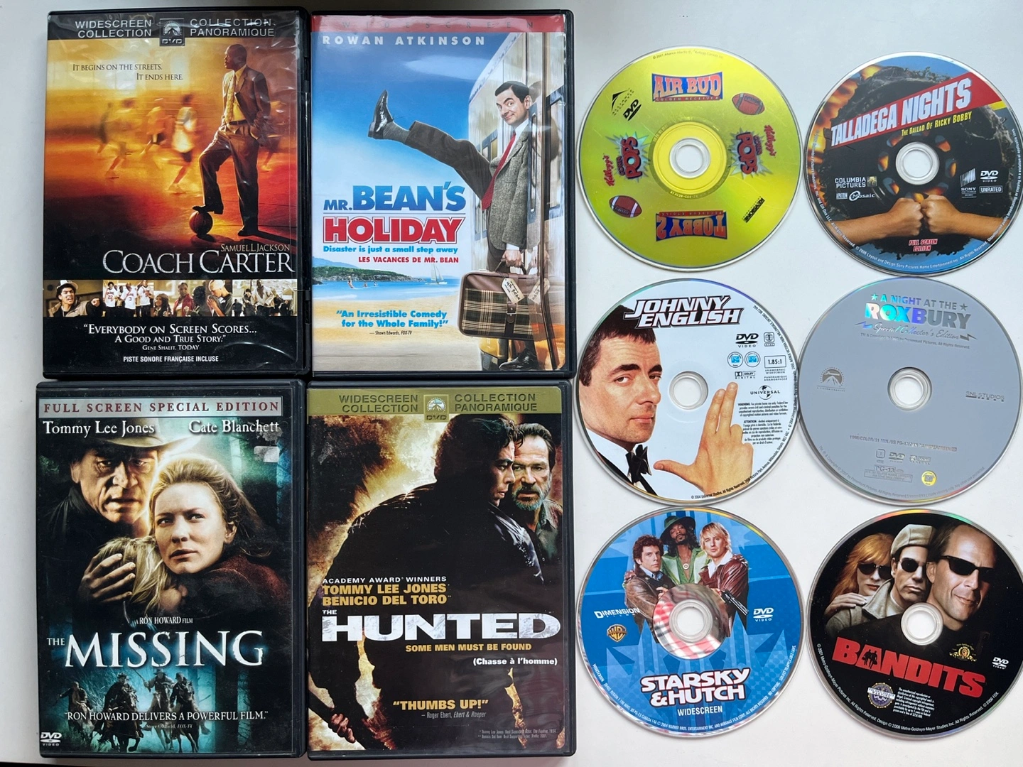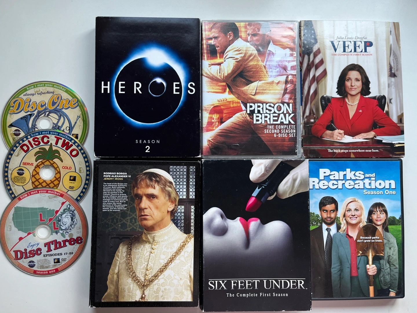 $3 each, or $5 for 2. Authentic. Over 70 titles available: TV SHOWS Heroes Season 2 How I Met Your Mother Season 1, 3 Parks and Recreation Season 1 Six Feet Under Season 1 The Borgias Season 2 The Office UK Season 2 Veep Season 1 ACTION/THRILLER 2012 (2009, John Cusack) 16 Blocks (2006, Bruce Willis) 21 (2008, Kevin Spacey) Angels & Demons (2009, Tom Hanks, Ewan McGregor) Body of Lies (2008, Leonardo DiCaprio, Russell Crowe) Chronicles of Narnia: the Lion Witch and the Wardrobe (2005) Clear and Present Danger (1994, Harrison Ford, Willem Defoe) Driven to Kill (2009) Four Brothers (2005, Mark Wahlberg) Hancock (2008, Will Smith, Charlize Theron) Hart's War (2002, Bruce Willis) Inception (2010, Leonardo DiCaprio) Lethal Weapon 3 (1992, Mel Gibson, Danny Glover) Lies and Illusions (2009) Mr. Brooks (2007, Kevin Costner) NEXT (2007, Nicholas Cage) Patriot Games (1992, Harrison Ford, Sean Bean) Played (2006) Revolver (2005, Jason Statham) Shooter (2007, Mark Wahlberg) The Bone Collector (1999, Denzel Washington, Angelina Jolie) The Day After Tomorrow (2004, Jake Gyllenhaal) The Hunt for Red October (1990, Sean Connery, Alec Baldwin) The International (2009, Clive Owen, Naomi Watts) Three Kings (1999, George Clooney, Mark Wahlberg) The Hunted (2003, Tommy Lee Jones, Benicio Del Toro) The Missing (2003, Tommy Lee Jones, Cate Blanchett) The Siege (1998, Denzel Washington, Bruce Willis) V for Vendetta (2005, Hugo Weaving, Natalie Portman) Vantage Point (2008, Dennis Quaid, William Hurt) COMEDY Air Bud (1997) American Dreamz (2006, Dennis Quaid) Bandits (2001, Bruce Willis, Cate Blanchett) Blades of Glory (2007, Will Ferrel, Jon Heder) Bruno (2009, Sacha Baron Cohen) Coach Carter (2005, Samuel L Jackson) Dodgeball: A True Underdog Story (2004, Vince Vaughan, Justin Long) Forgetting Sarah Marshall (2008, Jason Segel, Kristen Bell) Four Weddings and a Funeral (1994, Hugh Grant, Rowan Atkinson) Going Berserk (1983, John Candy) Johnny English (2003, Rowan Atkinson) Knocked Up (2007, Seth Rogen) Meet the Fockers (2004, Ben Stiller, Robert De Niro) Monty Python's Life of Brian (1979) Mr. Bean's Holiday (2007, Rowan Atkinson) Role Models (2008, Paul Rudd) Talladega Nights (2006, Will Ferrell, John C Reilly) Thank You for Smoking (2005, Aaron Eckhart) The Ex (2006, Jason Bateman) The Other Guys (2010, Will Ferrell, Mark Wahlberg) The Ugly Truth (2009) You Don’t Mess With the Zohan (2008, Adam Sandler) DOUBLE FEATURE (2 MOVIES IN 1) Above the Law (1988, action) / Fire Down Below (1997, action) Duplex (2003, comedy) / Flirting with Disaster (1996, comedy) Ghost Ship (2002, horror) / Dream Catcher (2003, horror) Gothika (2003, horror) / Queen of the Damned (2002, horror) Swingers (1996, comedy) / 40 Days and 40 Nights (2002, comedy) The Departed (2006, thriller) / Agent Trouble (1987, thriller) Uncle Buck (1989, comedy) / The Great Outdoors (1988, comedy) Under Siege (1992, thriller) / The Glimmer Man (1996, thriller) DRAMA Fight Club (1999, Edward Norton, Brad Pitt) Frost Nixon (2008) Shutter Island (2010, Leonardo DiCaprio, Mark Ruffalo) Sicko (2007, Michael Moore) The Ghost Writer (2010, Ewan McGregor, Pierce Brosnan) The Illusionist (2006, Edward Norton, Jessica Biel) The Patriot (2000, Heath Ledger, Jason Isaacs) Wall Street - Money Never Sleeps (2010, Michael Douglas, Shia Lebeouf) HORROR End of Days (1999, Arnold Schwarzenegger) Exorcist - The Beginning (2004) Return to Sleepaway Camp (2008) Stage Ghost (2001) The Omen (2006)