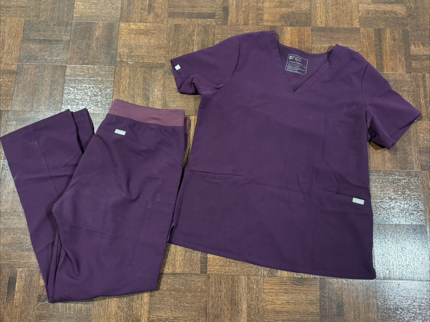 Selling a FIGS Deep purple scrub set, Casma L and Kade L/T. The set includes both the Casma top and Kade pants. Perfect for healthcare professionals!