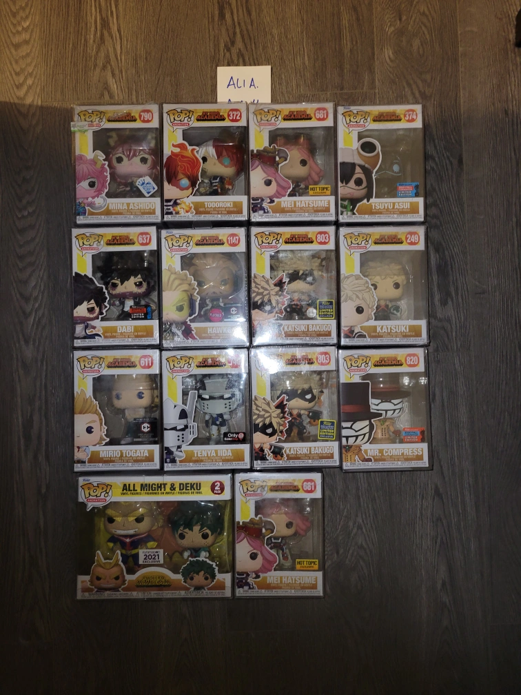 Selling a collection of My Hero Academia Funko Pops! Available characters include Mina Ashido, Todoroki, Mei Hatsume, Tsuyu Asui, Dabi, Hawks, Katsuki Bakugo, Mirio Togata, Tenya Iida, Mr. Compress, and All Might & Deku (2-pack). Great for any MHA fan or Funko collector!