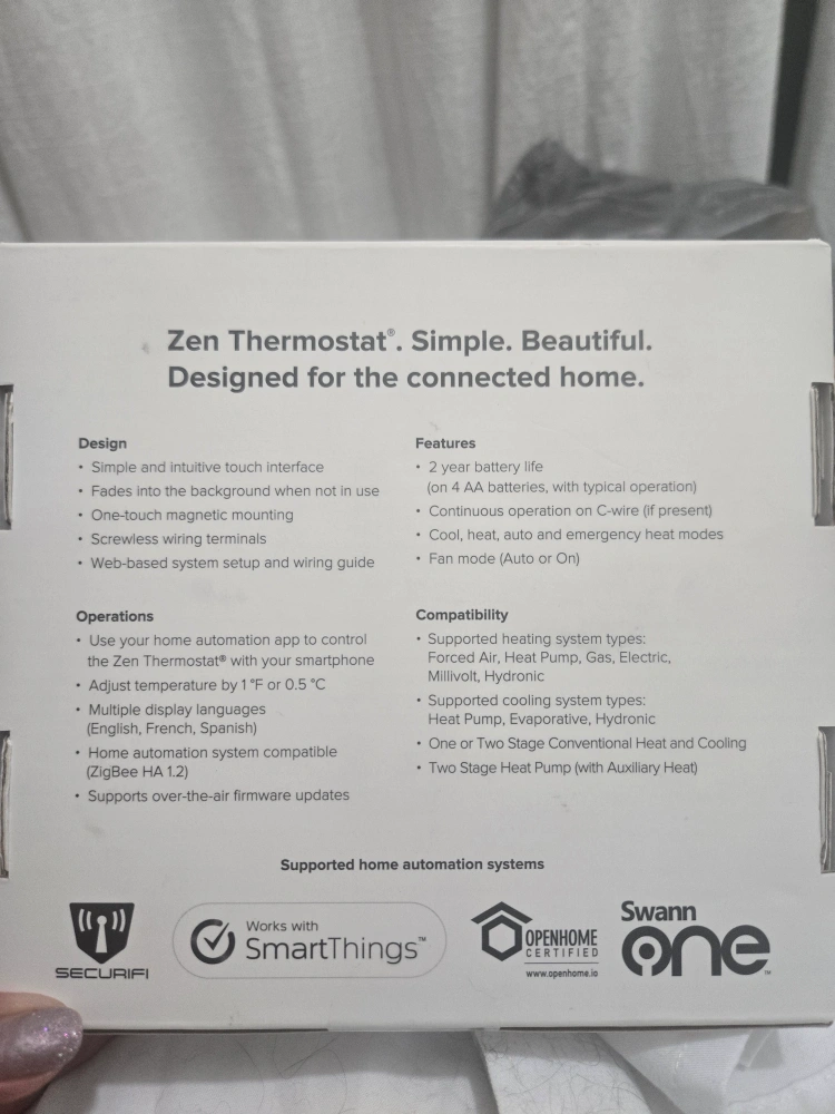 Selling a Zen Thermostat in white! It's brand new sealed in box with. It features a simple and intuitive touch interface and fades into the background when not in use. It also has one-touch magnetic mounting and screwless wiring terminals. You can use your home automation app to control the Zen Thermostat with your smartphone and adjust the temperature by 1°F or 0.5°C