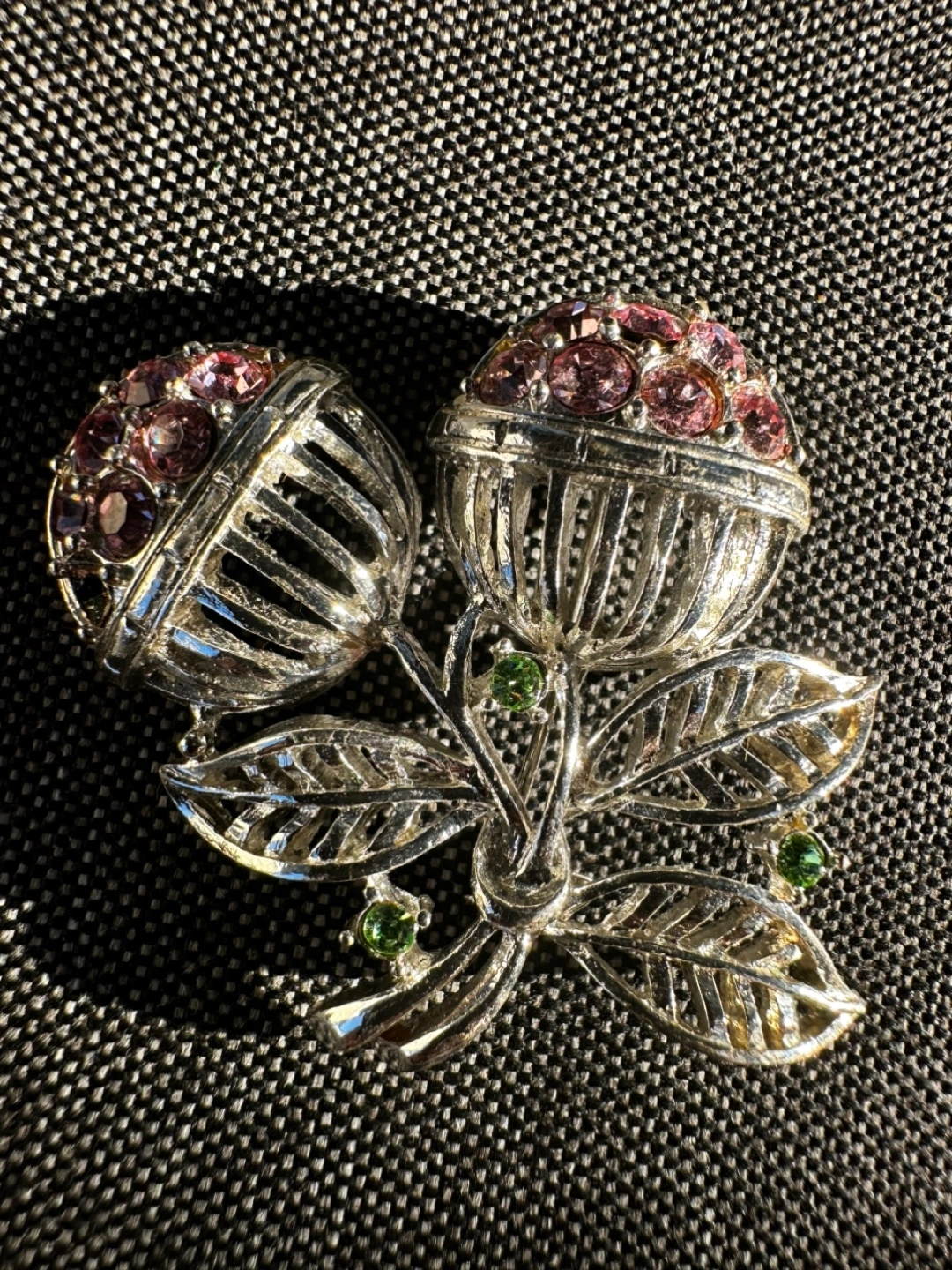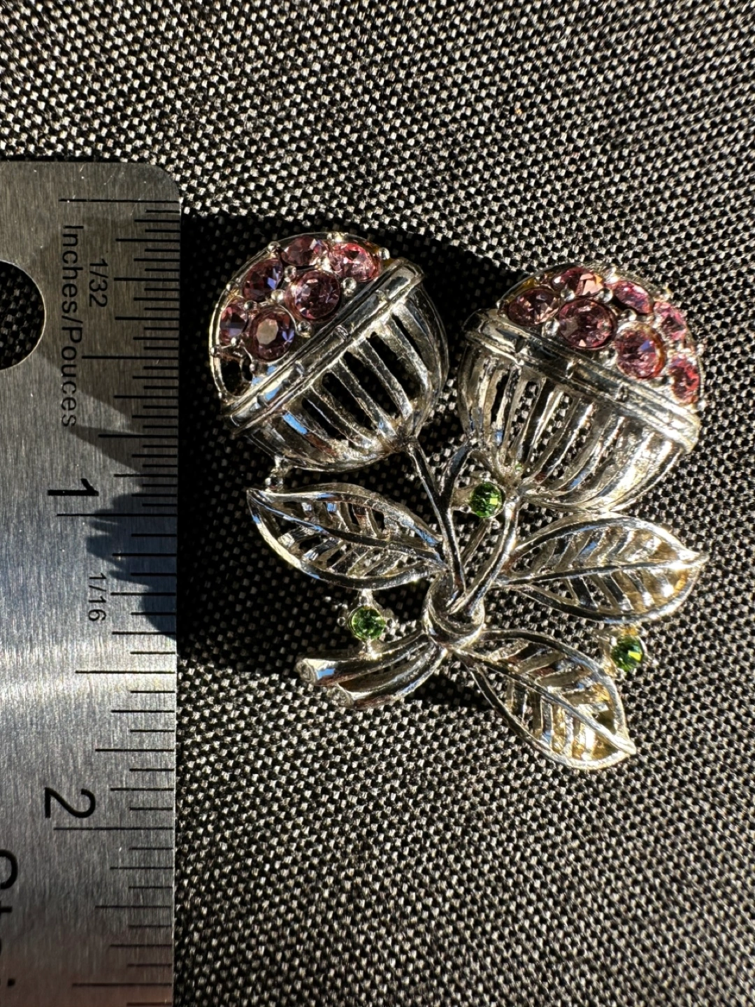 This is a lovely vintage brooch featuring a floral design with pink and green rhinestones. It's a unique piece that adds a touch of elegance to any outfit. The brooch is in good condition and measures approximately 2 inches in length.1 missing pink stone.