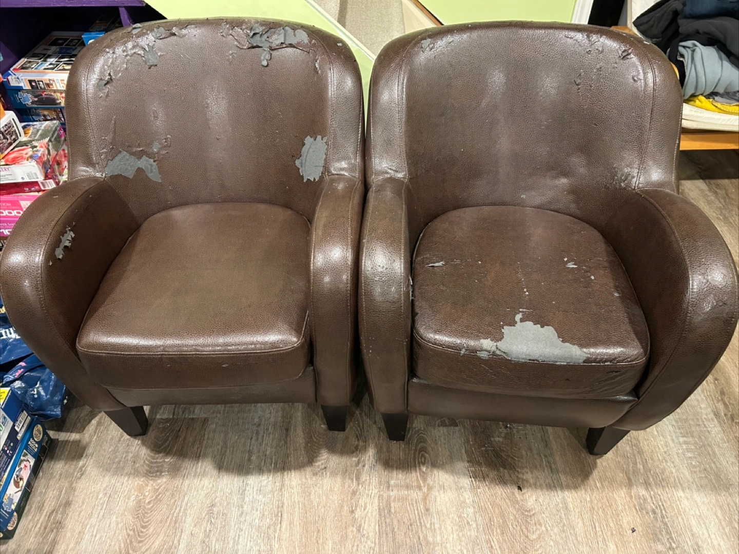 A pair of brown leather armchairs. They show significant wear and tear, as seen in the photos. Perfect for someone looking for a project or with a creative repurposing idea!