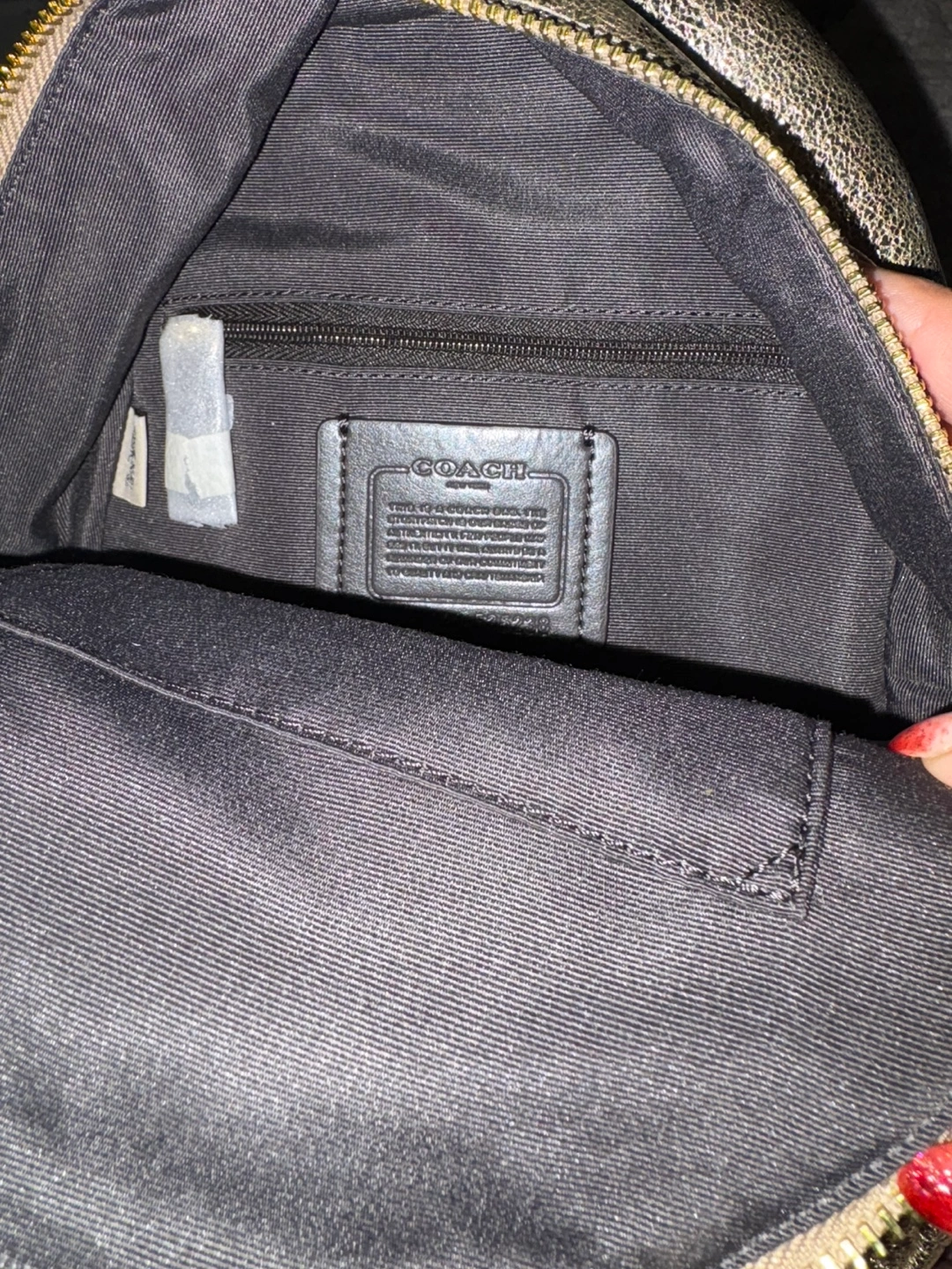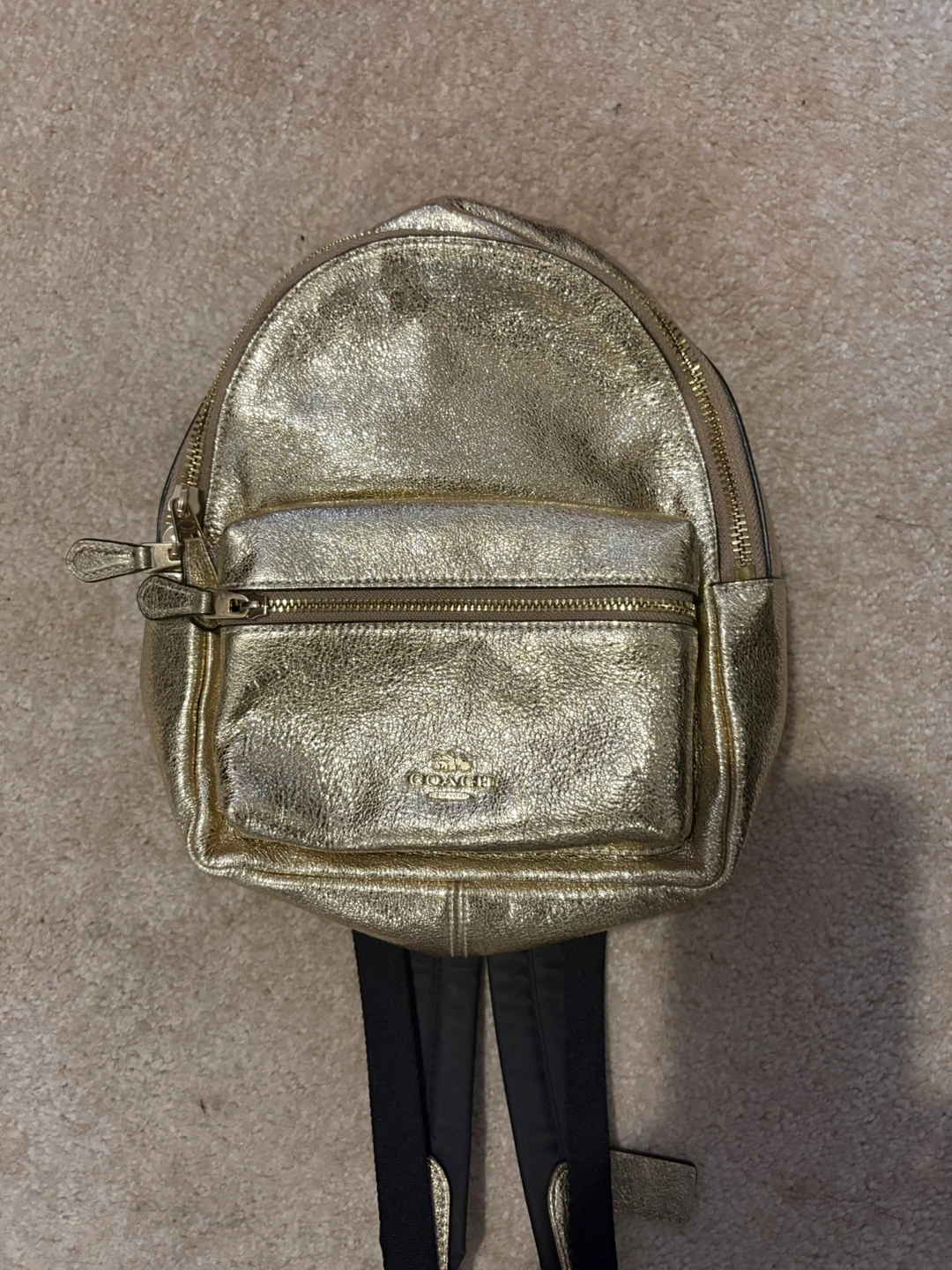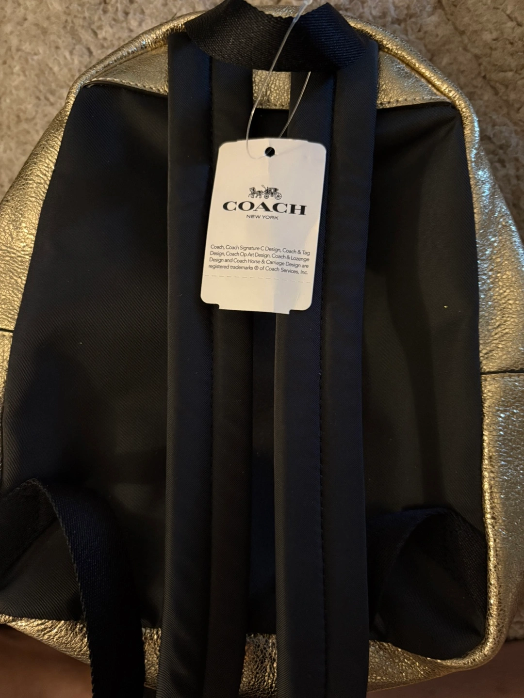 Selling a cute Coach mini backpack in a metallic gold colour. It's in great condition and perfect for carrying your essentials. The tag shows it originally retailed for $298! Pick up in Chestermere.
