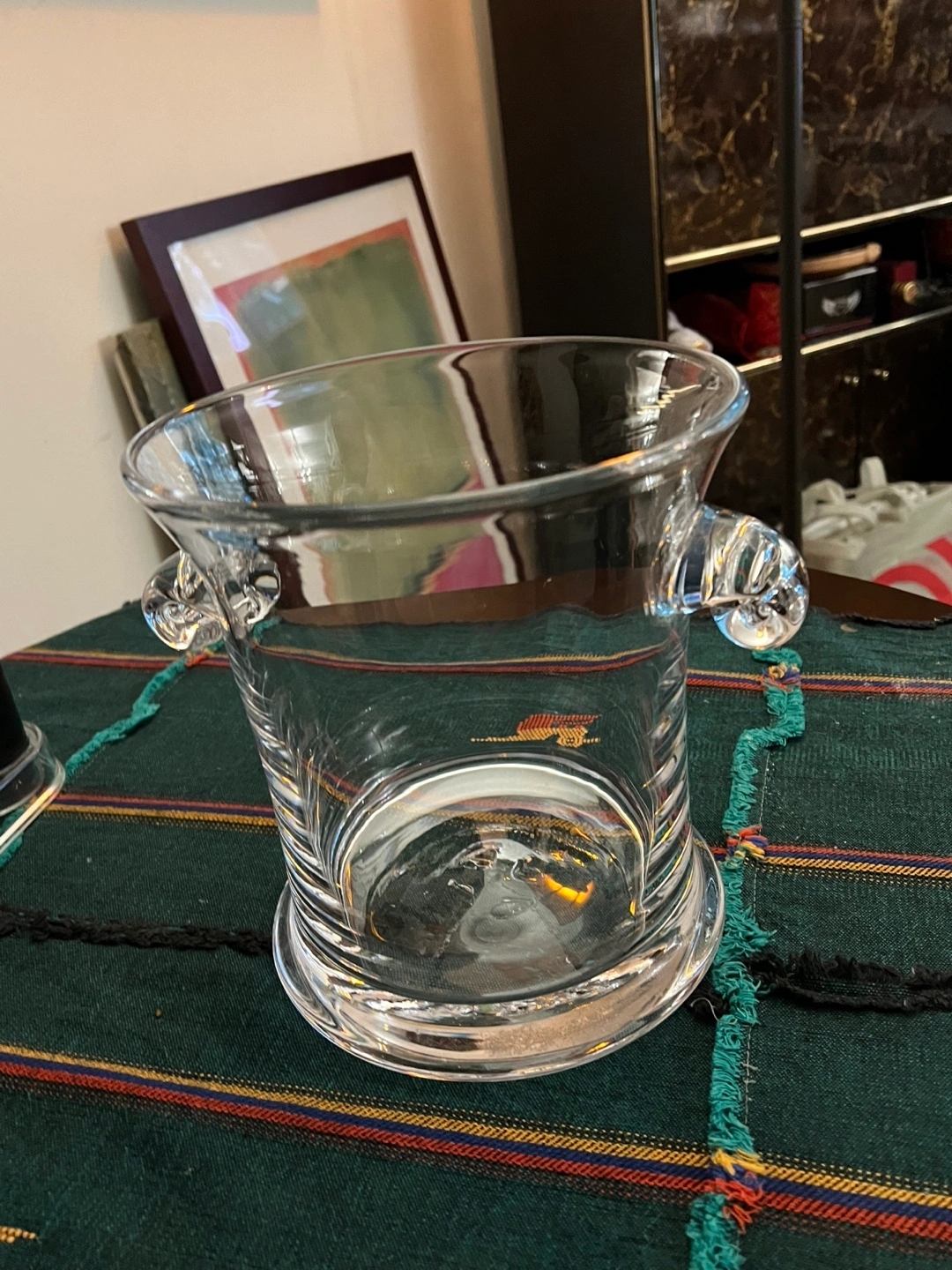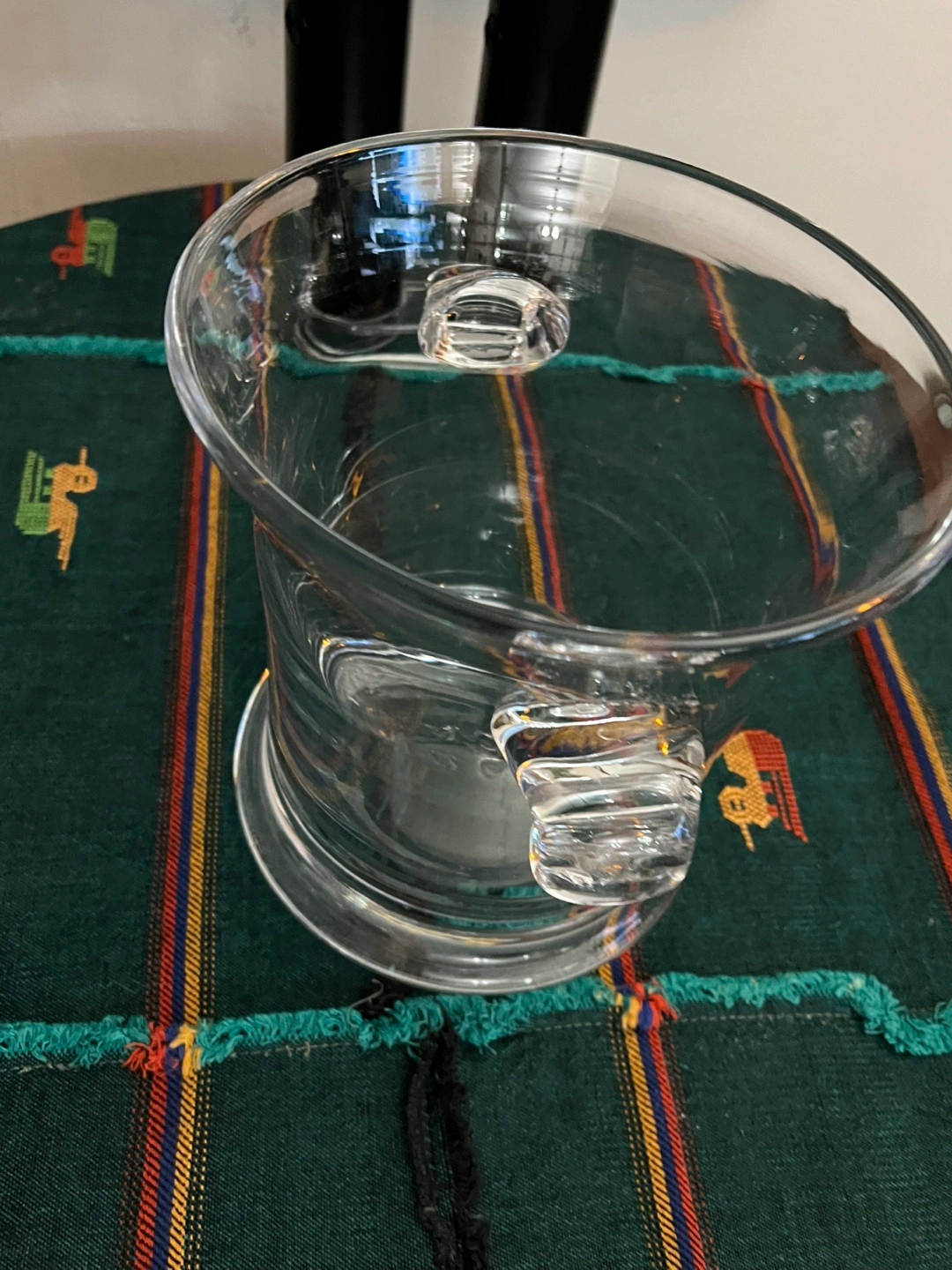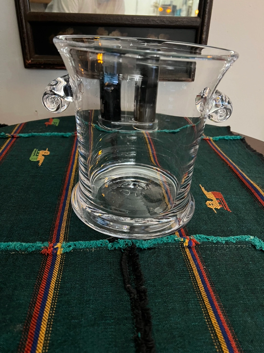 Selling a clear glass ice bucket with decorative handles. It's about 8 inches wide and 9.5 inches tall. Great for parties or keeping your drinks cold!