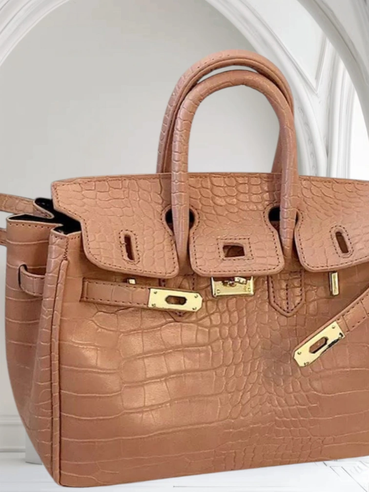 This is a stylish handbag with a crocodile embossed texture! It's a lovely pink colour and has gold-tone hardware. Perfect for adding a touch of elegance to any outfit, eh?