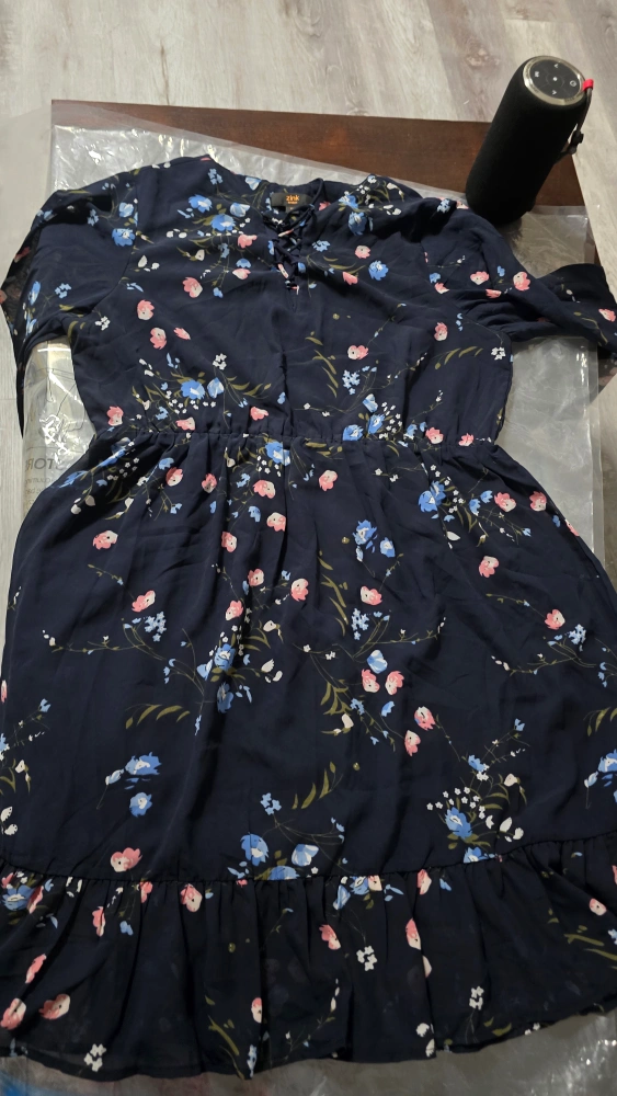 This Zink dress features a lovely floral print on a navy blue background. It has a cinched waist and a ruffle at the bottom. Perfect for a casual day out!